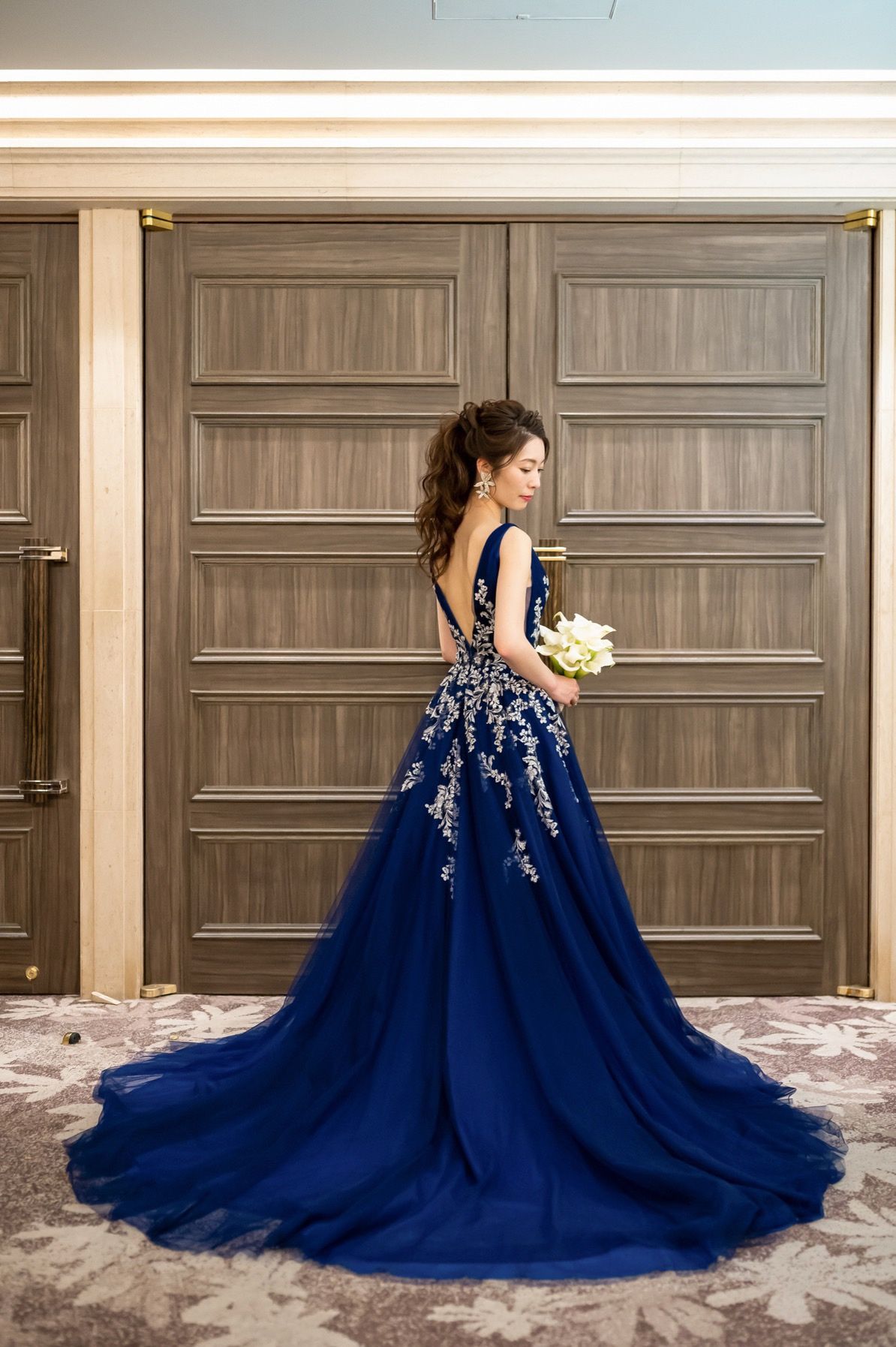 ・お色直し後:背中がざっくりと開いたドレスだったので、そこをしっかりと見せたく、ポニーテールスタイルにしました。