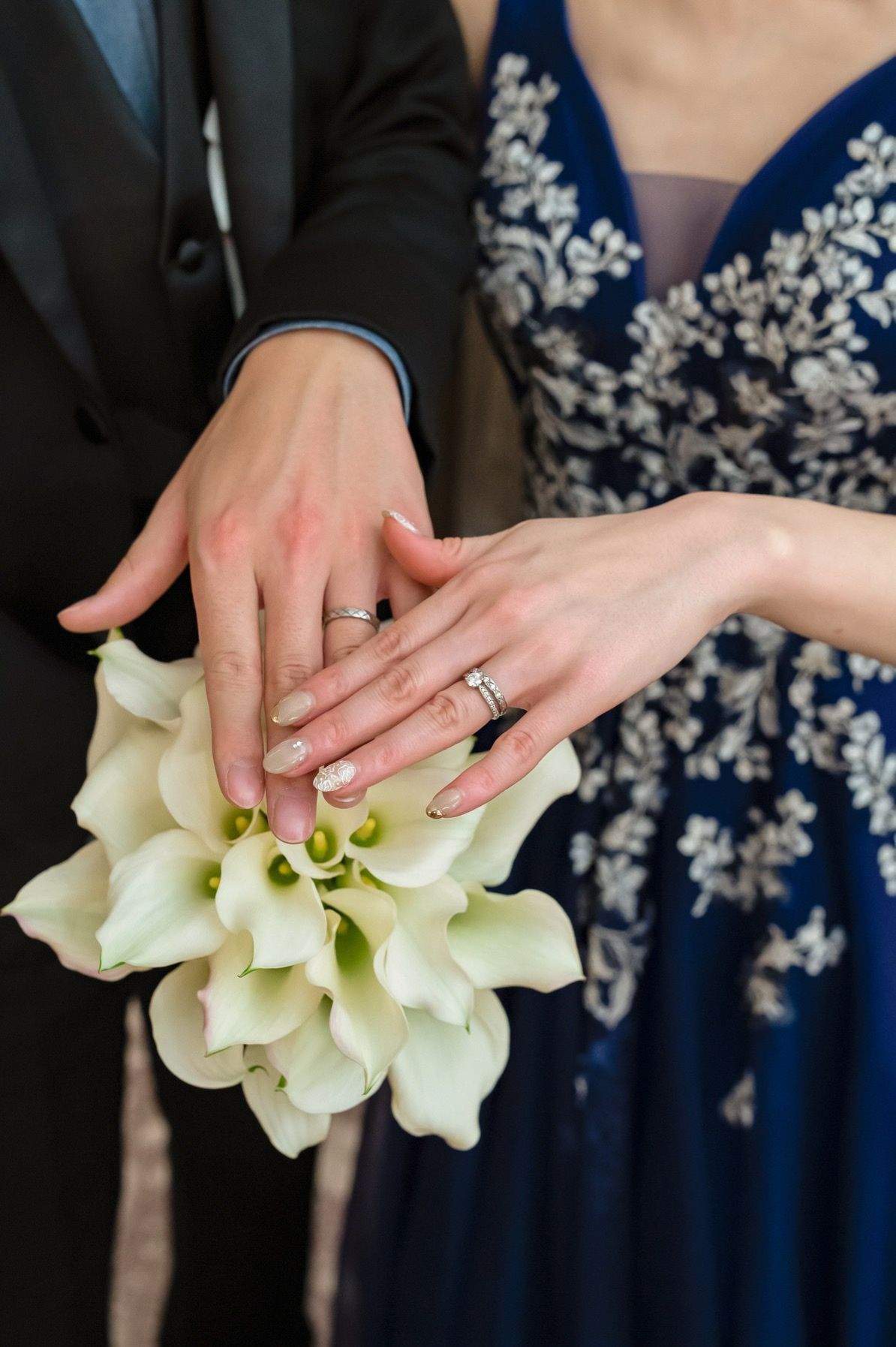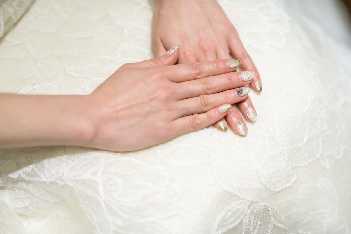 ネイリストの友人にしてもらいました。ネイリストになってから、いつか自分の結婚式でネイルをデザインしてもらうと話していました。ようやく実現できて、本当に嬉しかったです。WDドレスの花柄のデザインを、ネイルに書いてもらいました。世界で1つだけの自分だけのネイルで、とっても特別な思い出になりました!