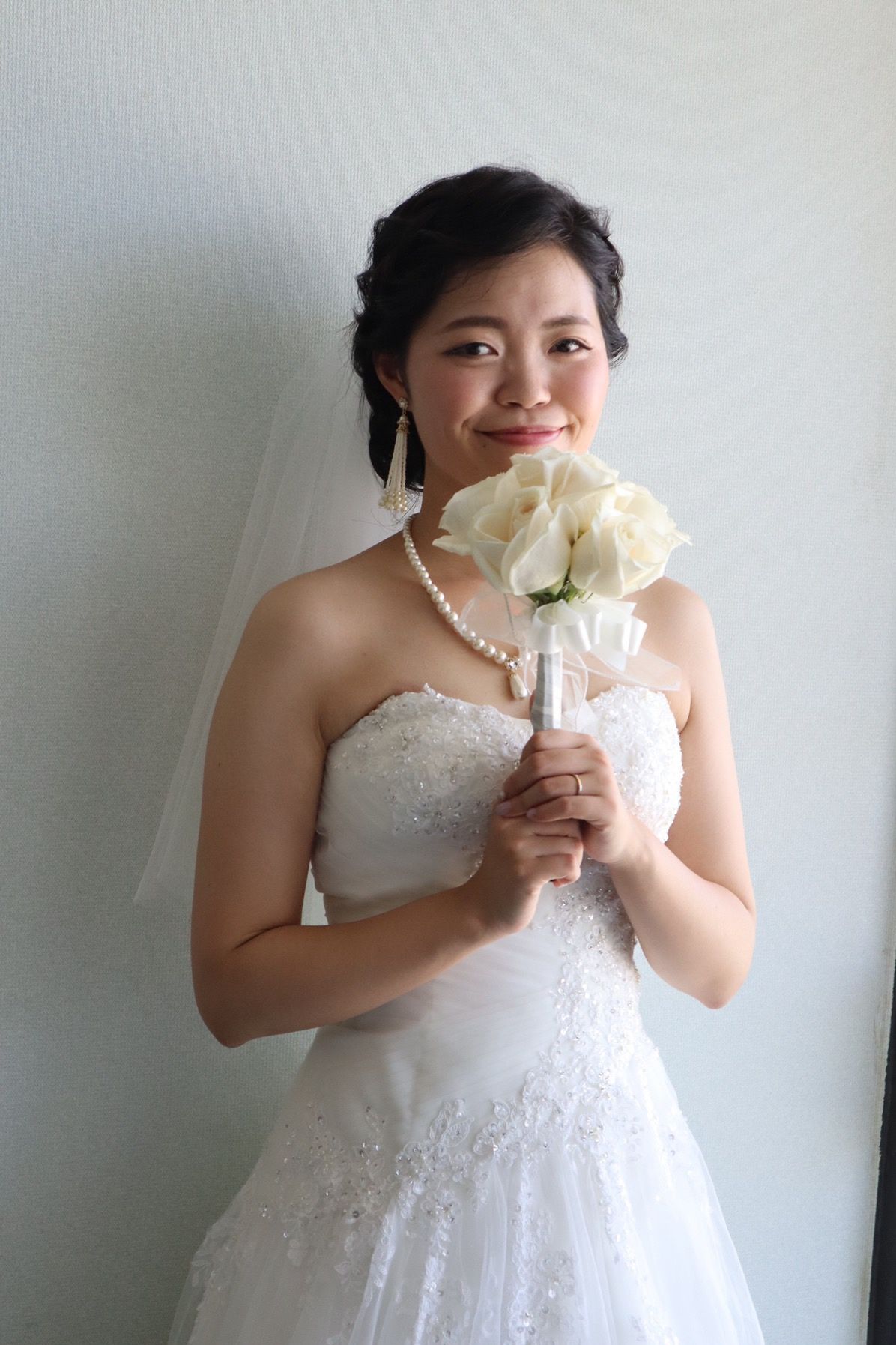 挙式ではANEMONEのパールフリンジピアスと大振りパールネックレス、ドレスがシンプルなのでアクセサリーでインパクトを足しました。