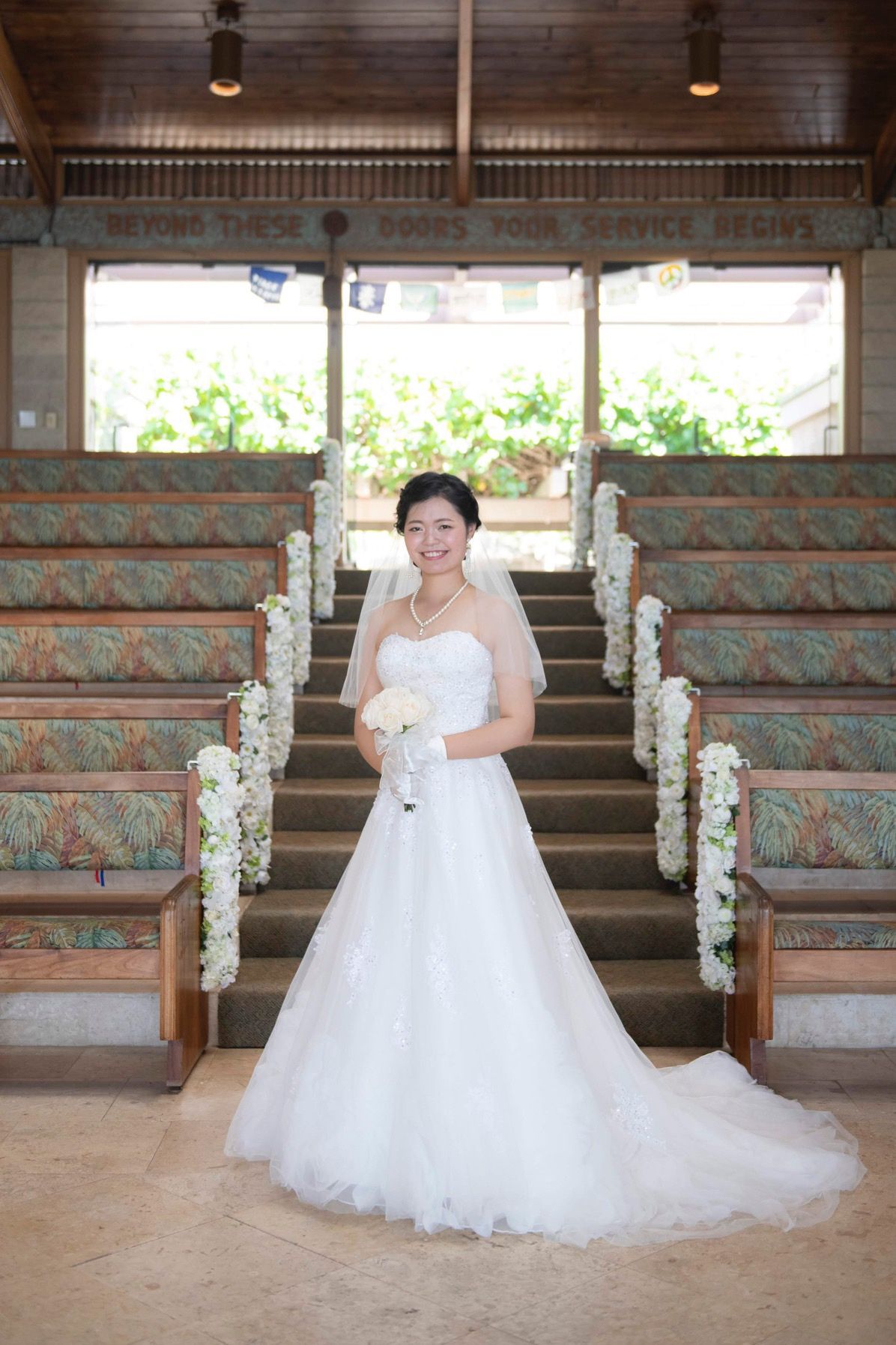 ハワイの方が普段から礼拝に行く、キャルバリーバイザシー教会は300人入る教会です。バックに海が見える式場がよかったのと、ハワイの昔ながらの伝統を守る木目調のどちらも叶えられた式場でした。開放感と海の青さや教会の雰囲気が最高の景色でした。