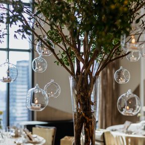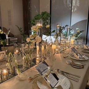 また、全ての卓にハンギングガラスやキャンドル、テーブルミラーを置いて、照明を落とした際にキラキラと反射して輝くようにしているのもポイントです。