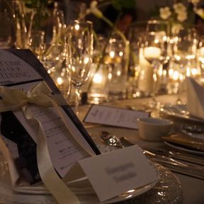 披露宴会場にゲストが入場する際はライトを消してハンギングガラスとキャンドルのみの明るさにし、ディズニーのエリアミュージックを流して幻想的な空間を演出。より私たちの創りあげた"Blue Bayou"に没入してもらえるようにしました。