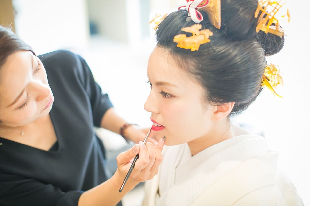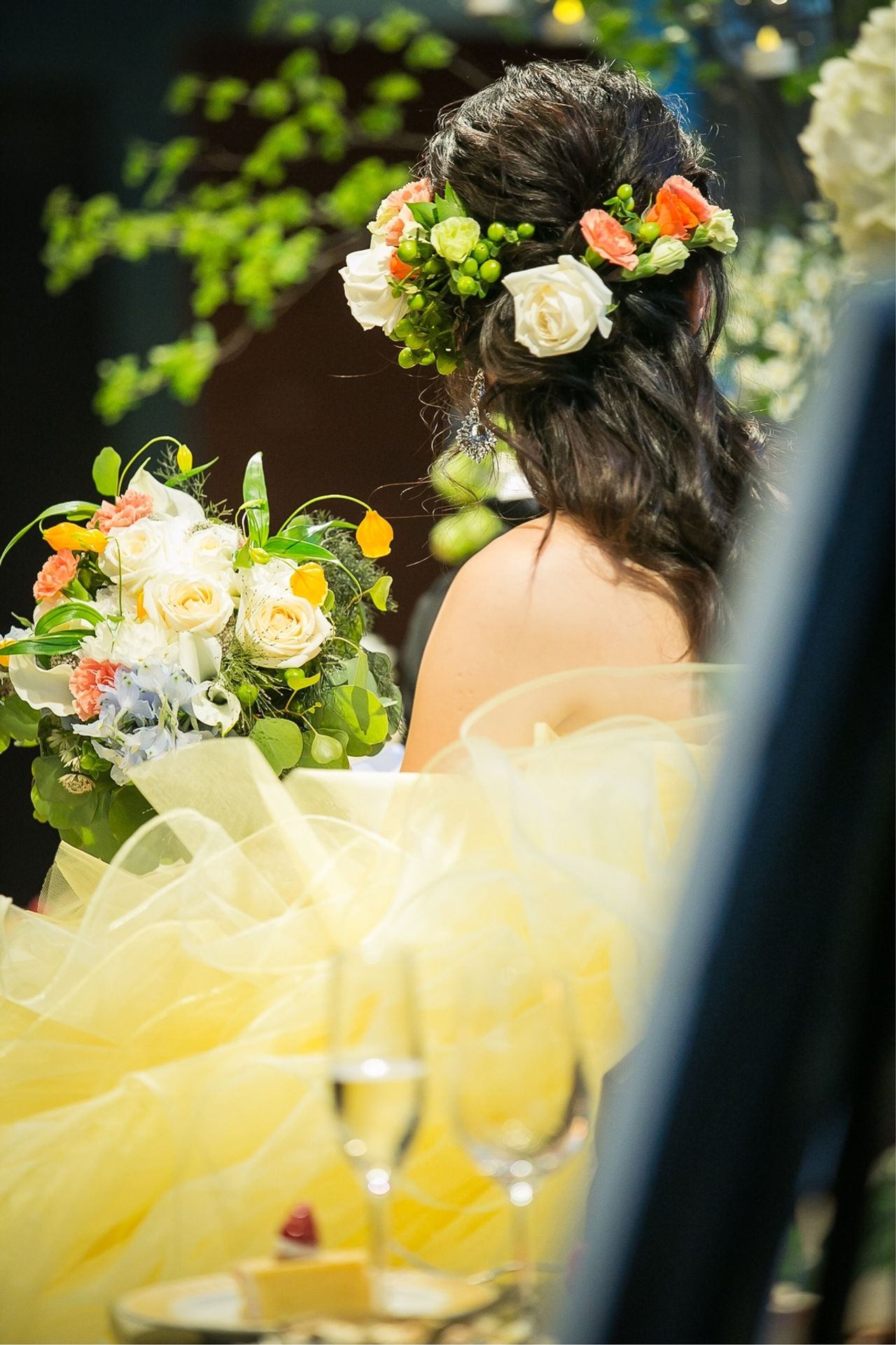挙式は白無垢、自分の髪の毛で日本髪を結ってもらいました。 白無垢を着るなら本格的な日本髪がしたくて、鼈甲の髪飾りもつけました! 披露宴はふんわりまとめ髪にヘアチェンジ。 ドレスのときはナチュラルな雰囲気でダウンスタイルに。 生花の髪飾りで華やかにしてもらいました。