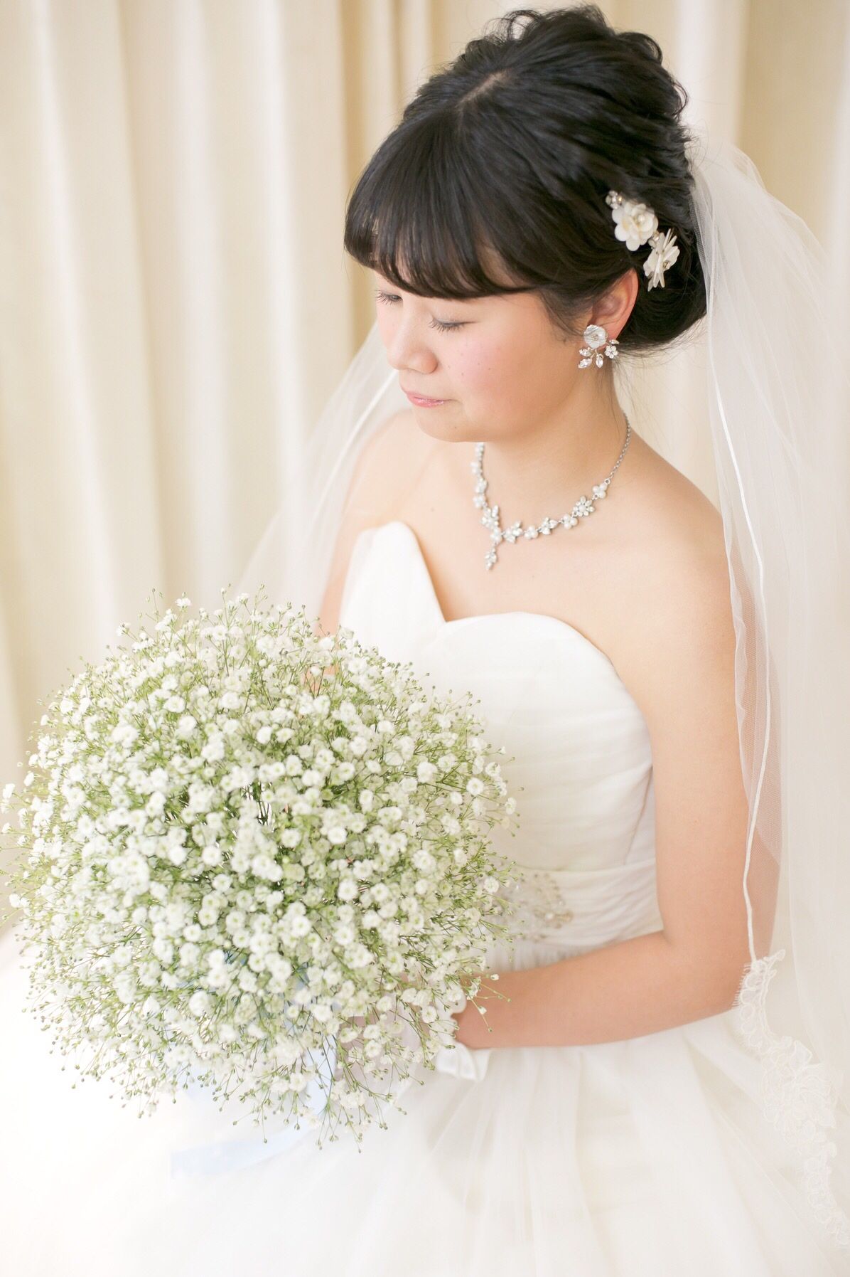 挙式はシニヨン、披露宴はサイドアップに生花のかすみ草を散りばめてもらいました。
