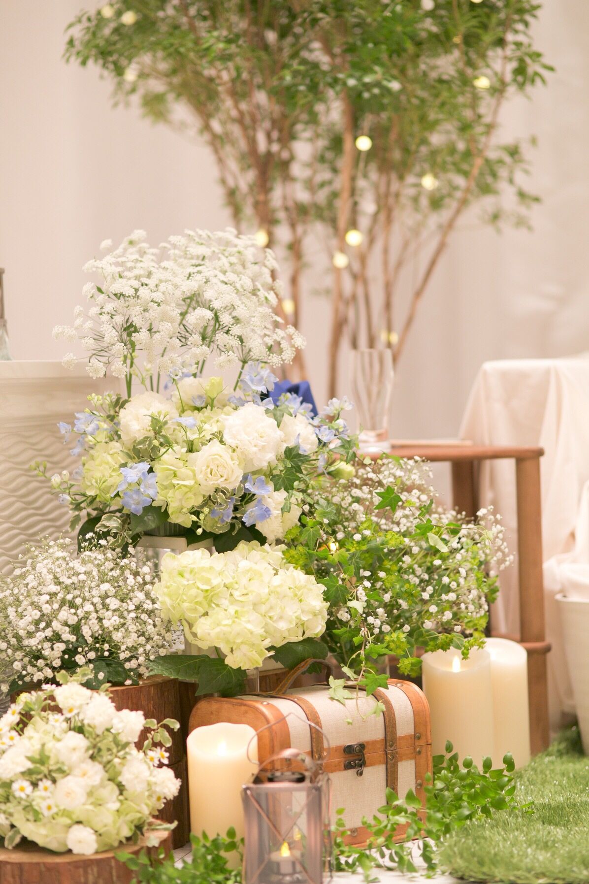 かすみ草を多めに、大きな花(バラなど)は避けてもらって、丸太やキャンドルなどナチュラルな小物も飾ってもらいました。
