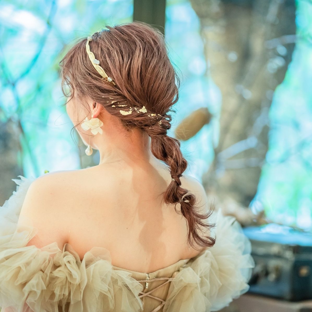 式に向けて何度もサロンに通ってヘアメンテナンスをしていただきながら、2人でドレスに似合うもの、骨格に合うものを話し合いながら決めています!