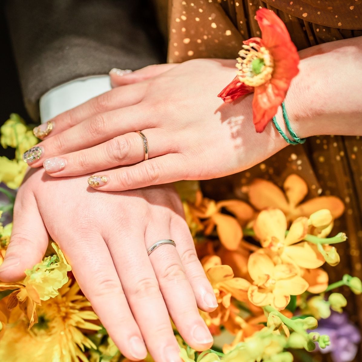 せっかくなら夫婦で似たようなデザインがよかったので色味はそれぞれの好みのもの、形は婚約指輪と重ね付けしても違和感がないものにしました。