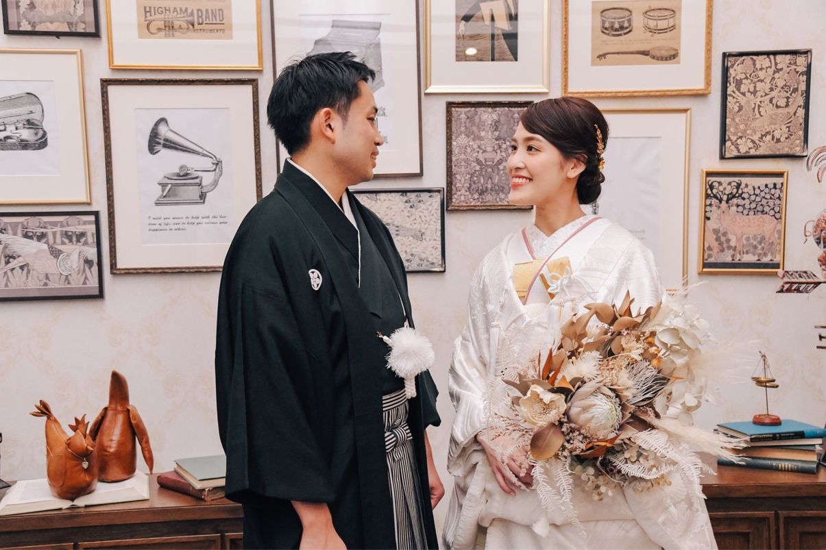 お色直しだったので色打掛と悩みに悩みましたが、小物との相性も考え憧れの白無垢に♡小物のゴールドと重ね襟のピンクをさし色にしました。写真映えしてよかったです。
