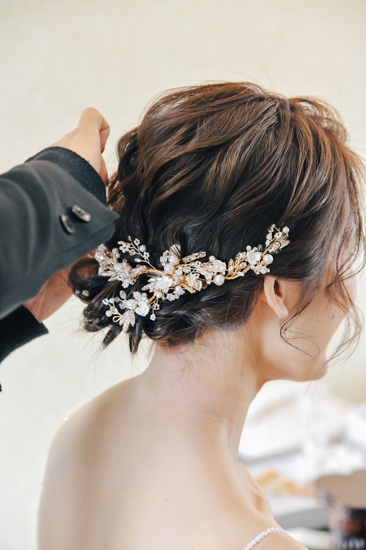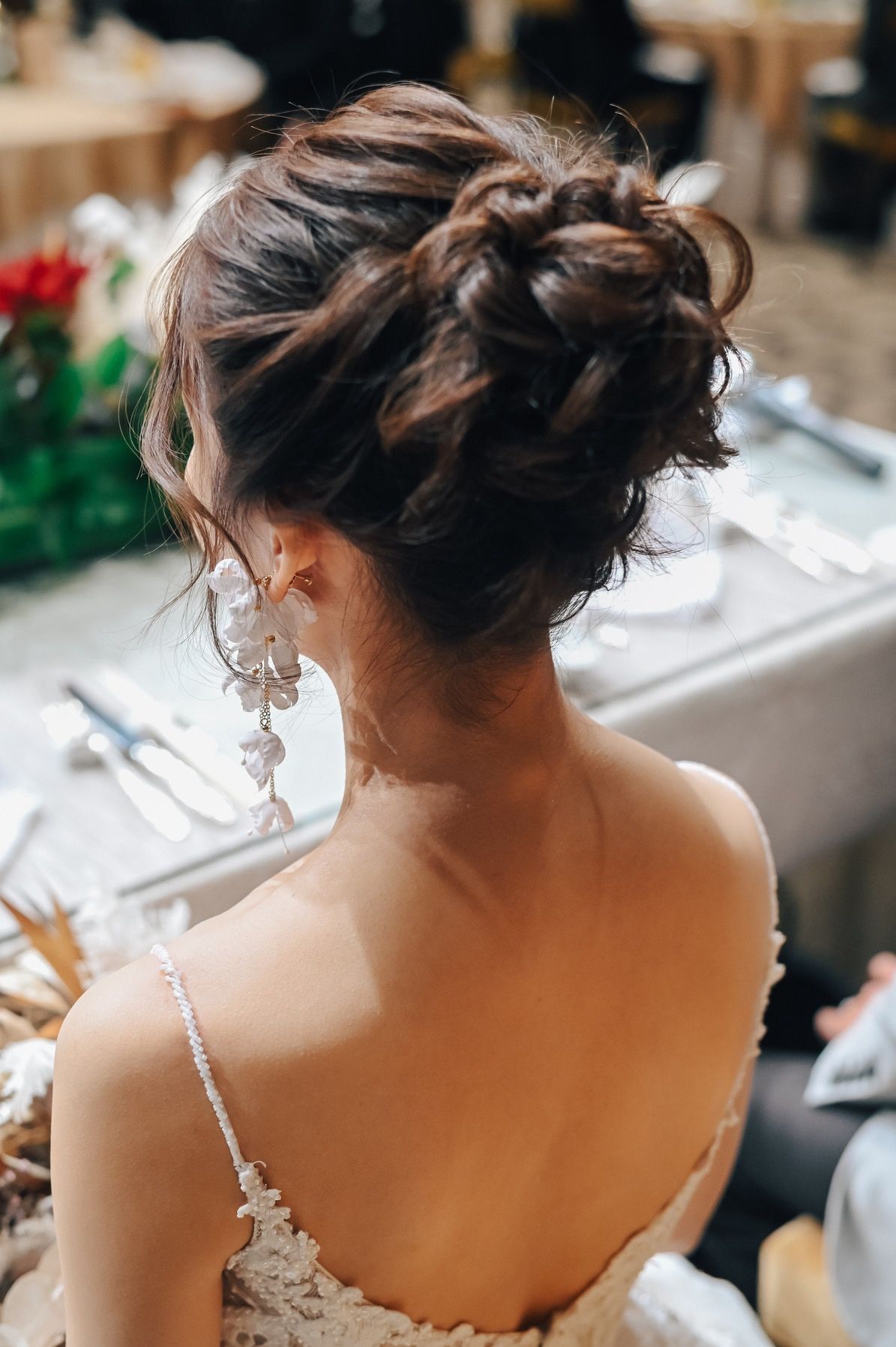 挙式はシンプルに低めのシニヨンで、お任せしました。披露宴入場で前髪を下ろしアップヘアに♡ドレスに合わせて可愛らしい雰囲気を出してもらいました。お色直しはツルンとした低めのお団子ヘアに。和風になりすぎないようお団子は小さめにしていただきました。