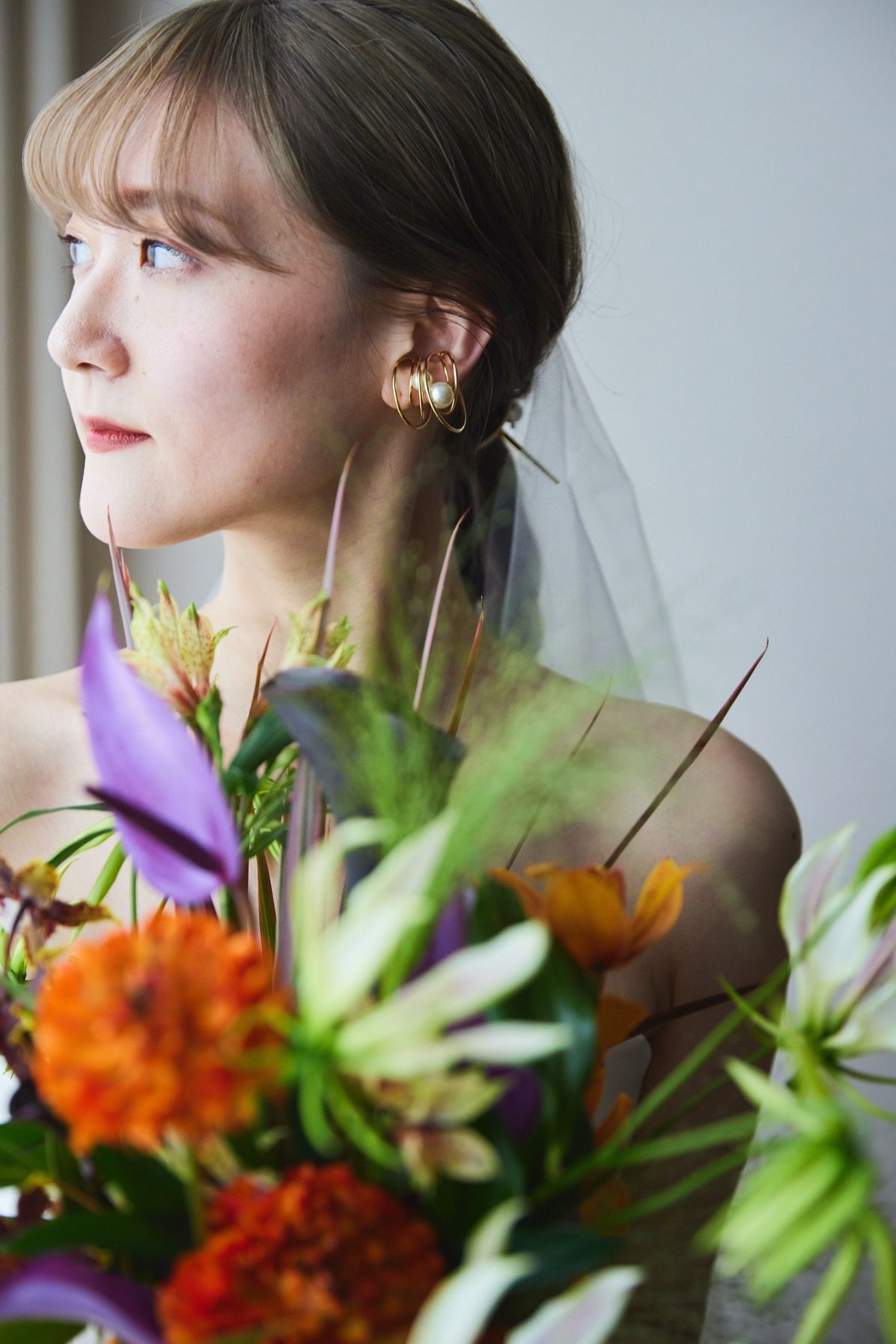 ・2着目は、トレンド感のある雰囲気をイメージしました!ウェーブの前髪と、高めのおだんごはずっとやりたいと思っていたので、念願が叶って良かったです。