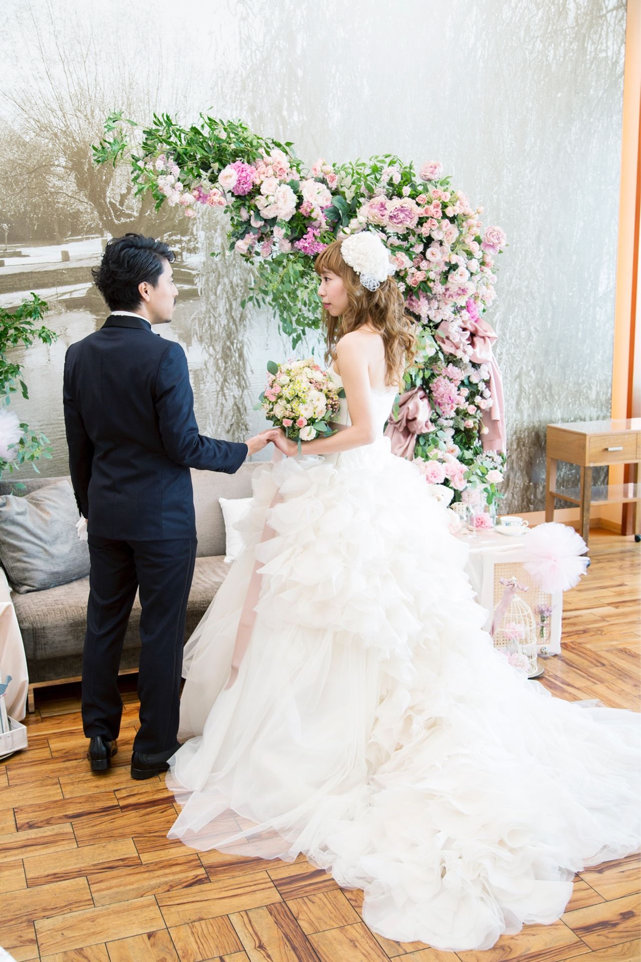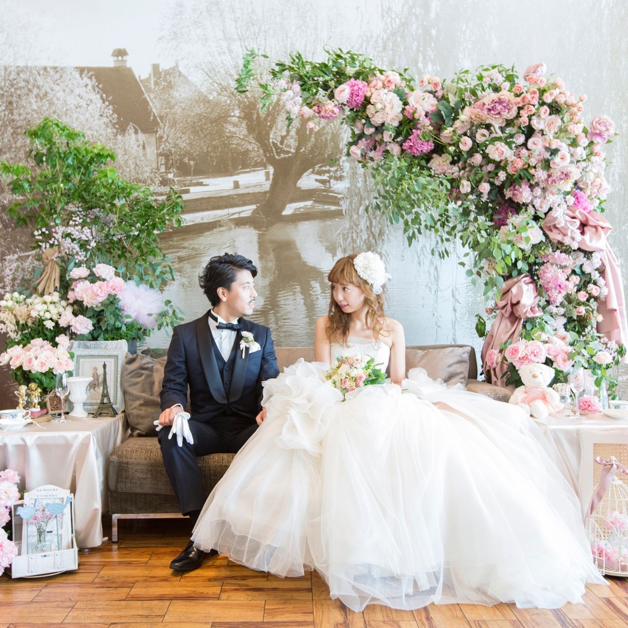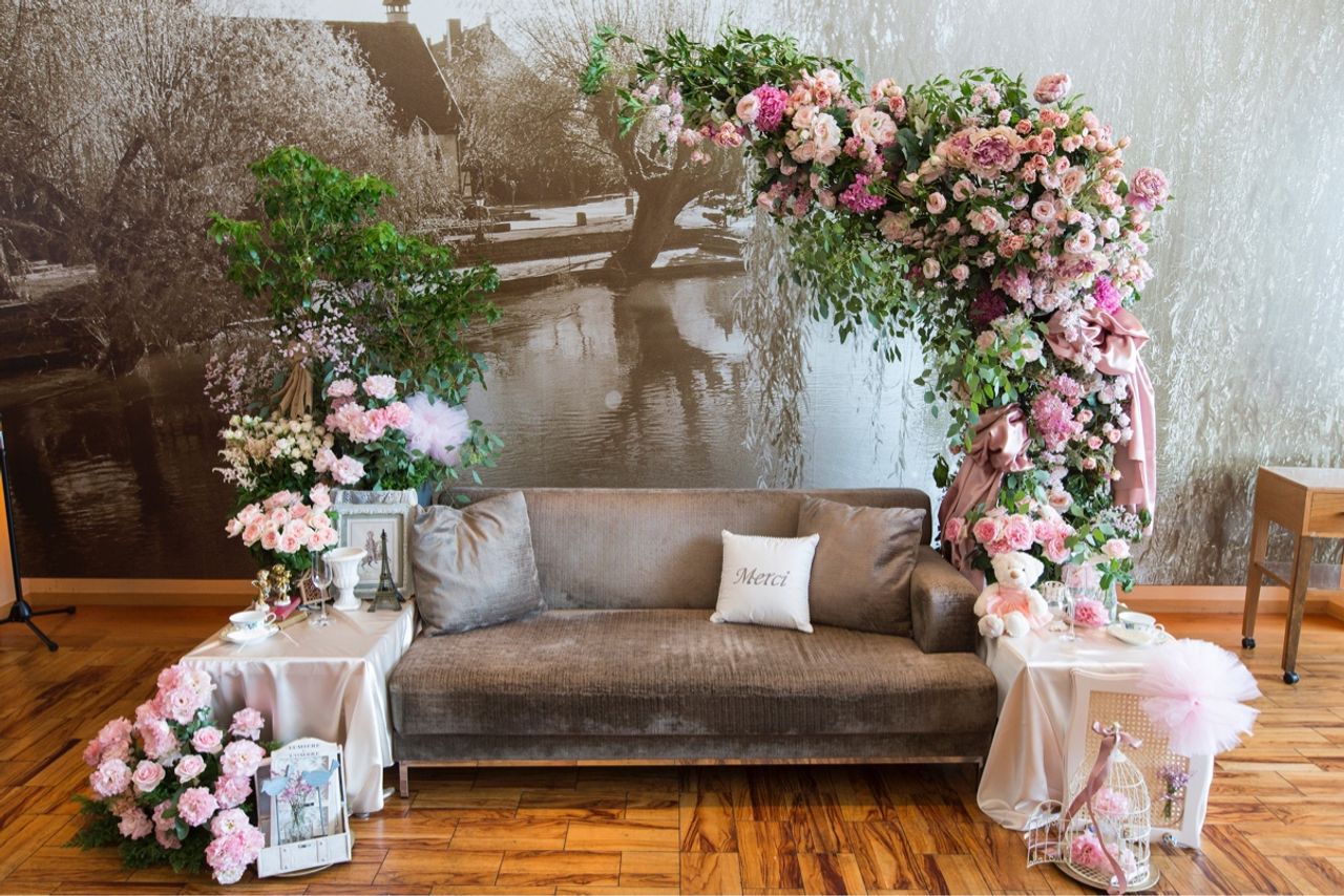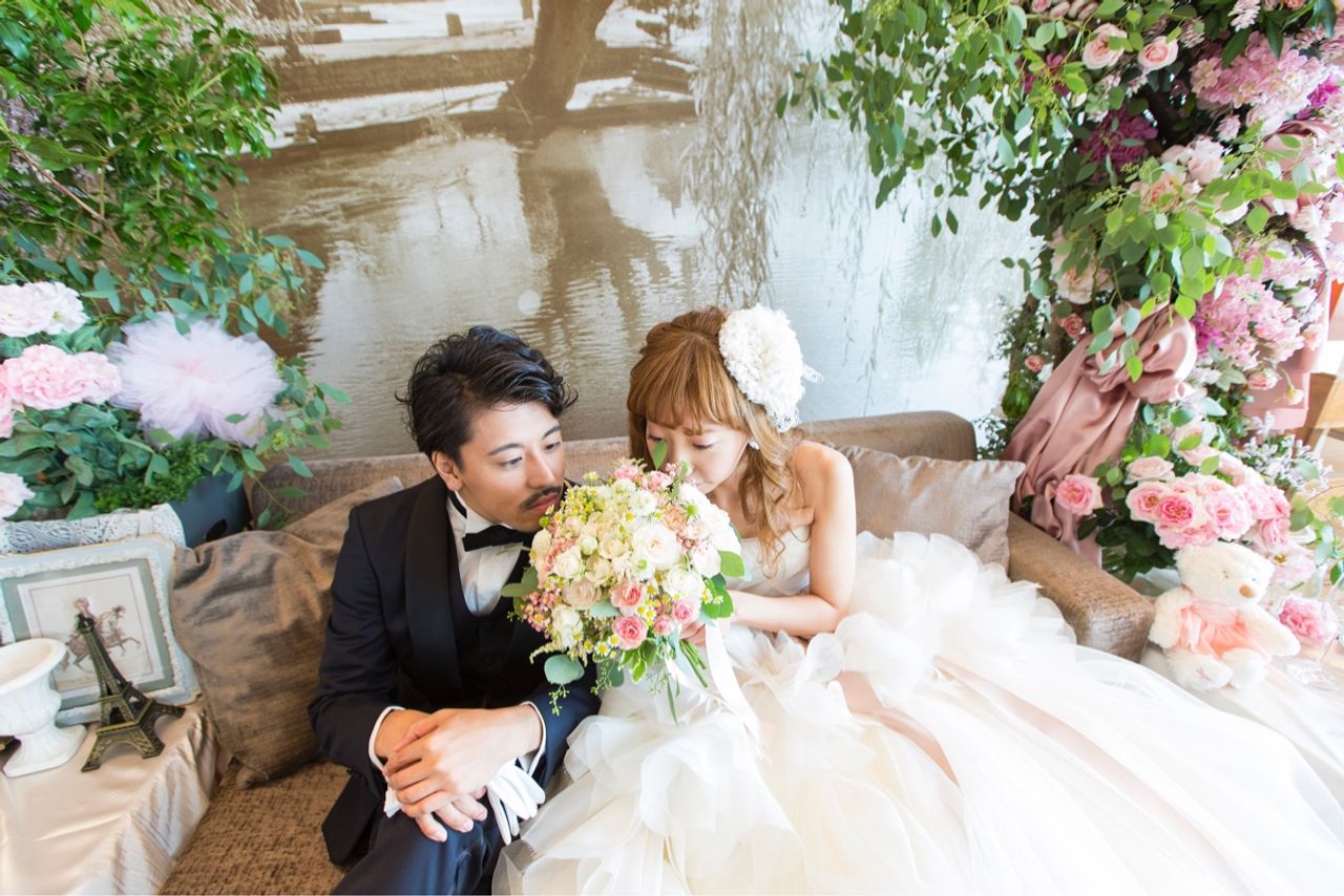 その淡いピンクのお花のイメージをそのままま会場装花にも施しました。 特にこだわった高砂はとにかく華やかに、決して華美ではなく品も残しつつ海外の雰囲気にしたかったのでグリーンも使いつつアーチ状にお花をつくってもらいました。ソファの周りには国内やフランスの雑貨屋さんを回って集めた小物をかざりました。