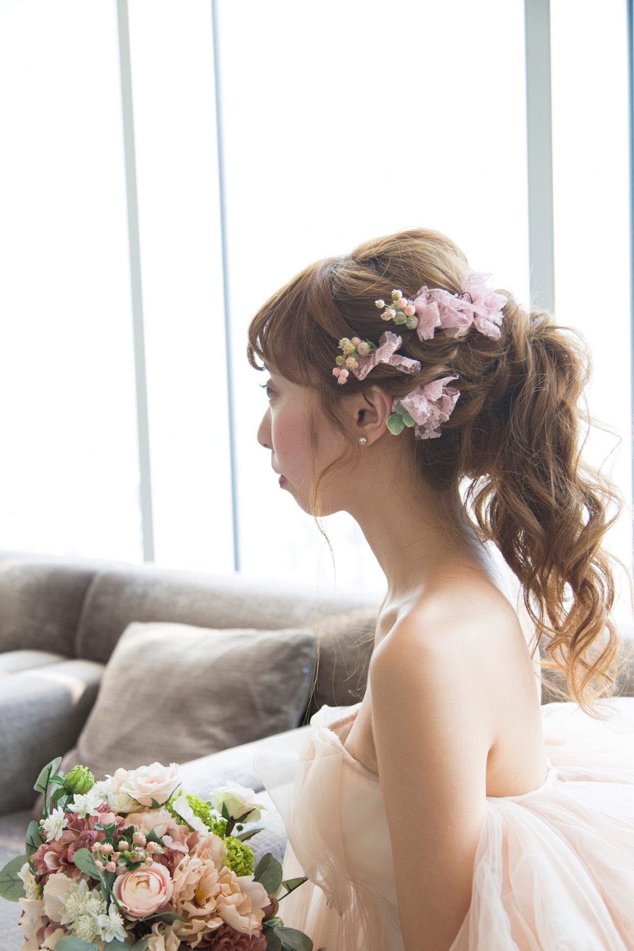 お色直しではふわふわのポニーテール。