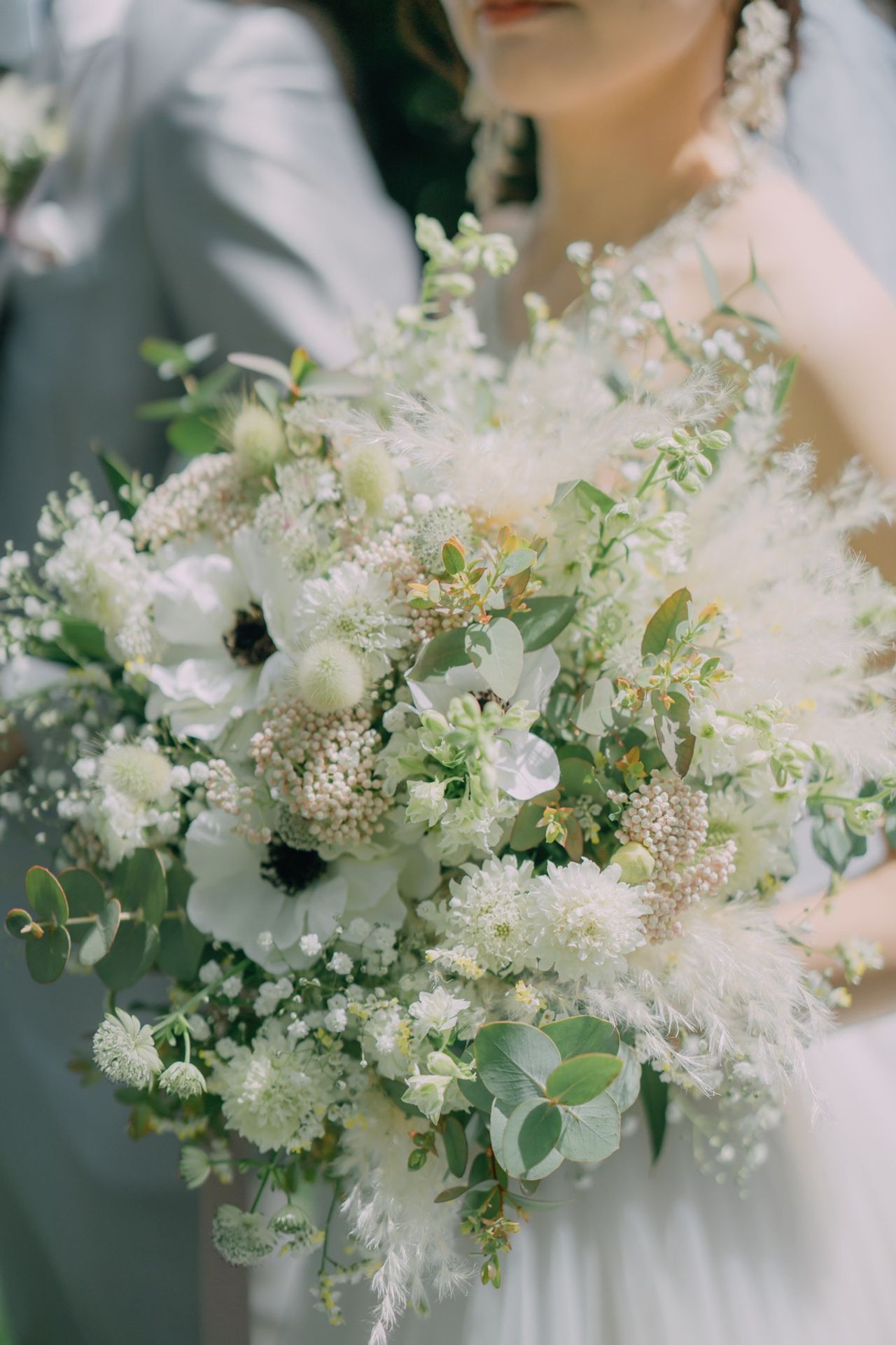 白ドレスのブーケはアネモネをメインで入れて欲しいということと、ブーケのリボンとお花にくすみピンクを入れて欲しいとお願いしました。