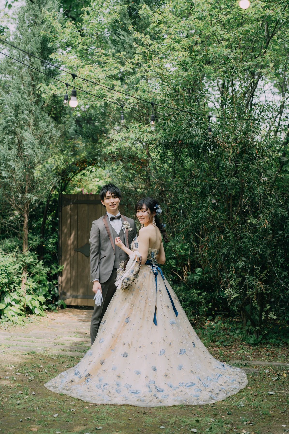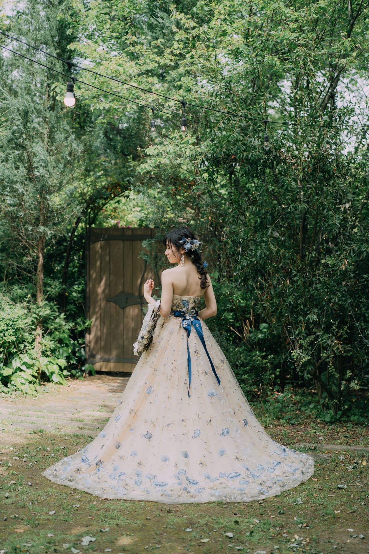 アイボリーの生地にブルーの花柄刺繍のレースを合わせたとても華やかで可愛いらしいドレスでした。