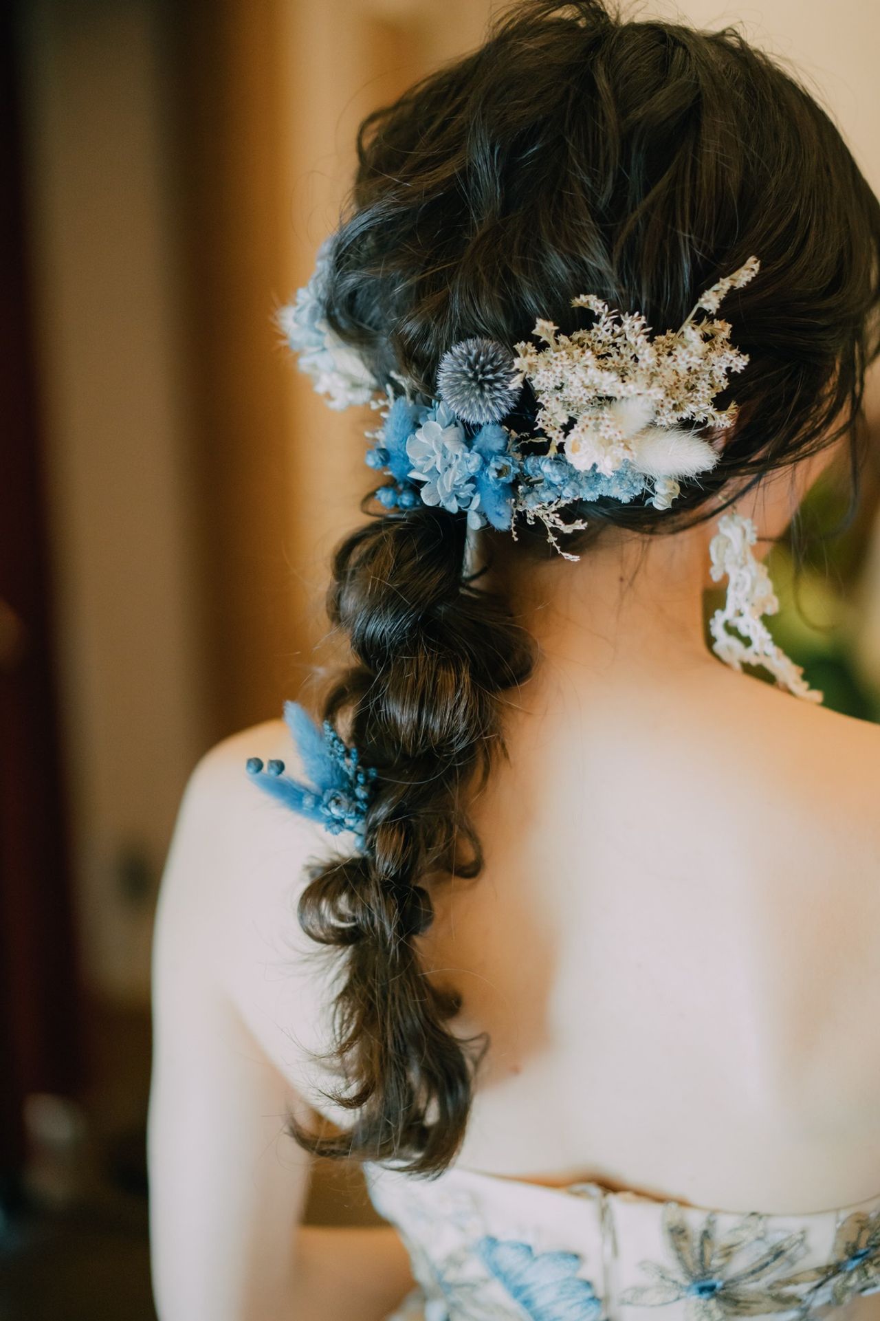 青い刺繍の花柄ドレスに合うように色を合わせて、ドライフラワーやプリザーブドフラワーを小さい花束のような感じでまとめたようなヘアアクセを自分で作りました。