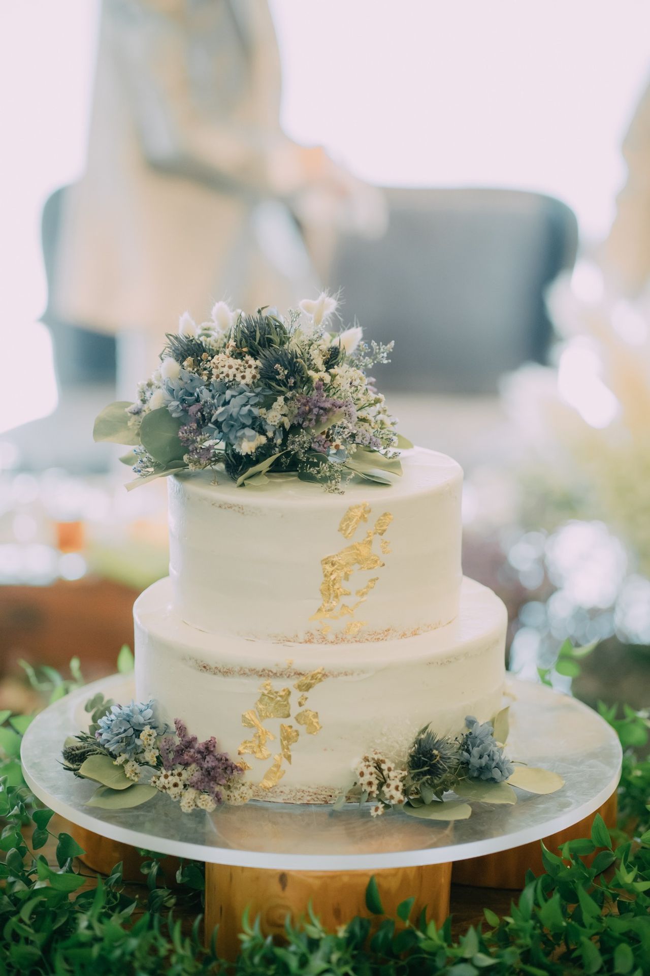 装花に合わせたお花が載った2段ケーキをオーダーしました。正面のみですが、金箔を散らしてもらい華やかなウェディングケーキにしてもらいました。