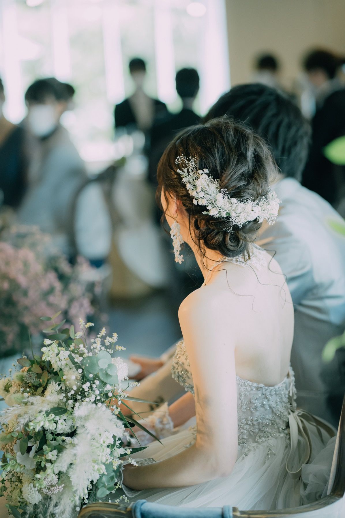 白ドレスと差をつけたかったので、編み込みヘアでダウンに。ドライフラワーの髪飾りを編み込みに差し込んで散りばめてもらいました。
