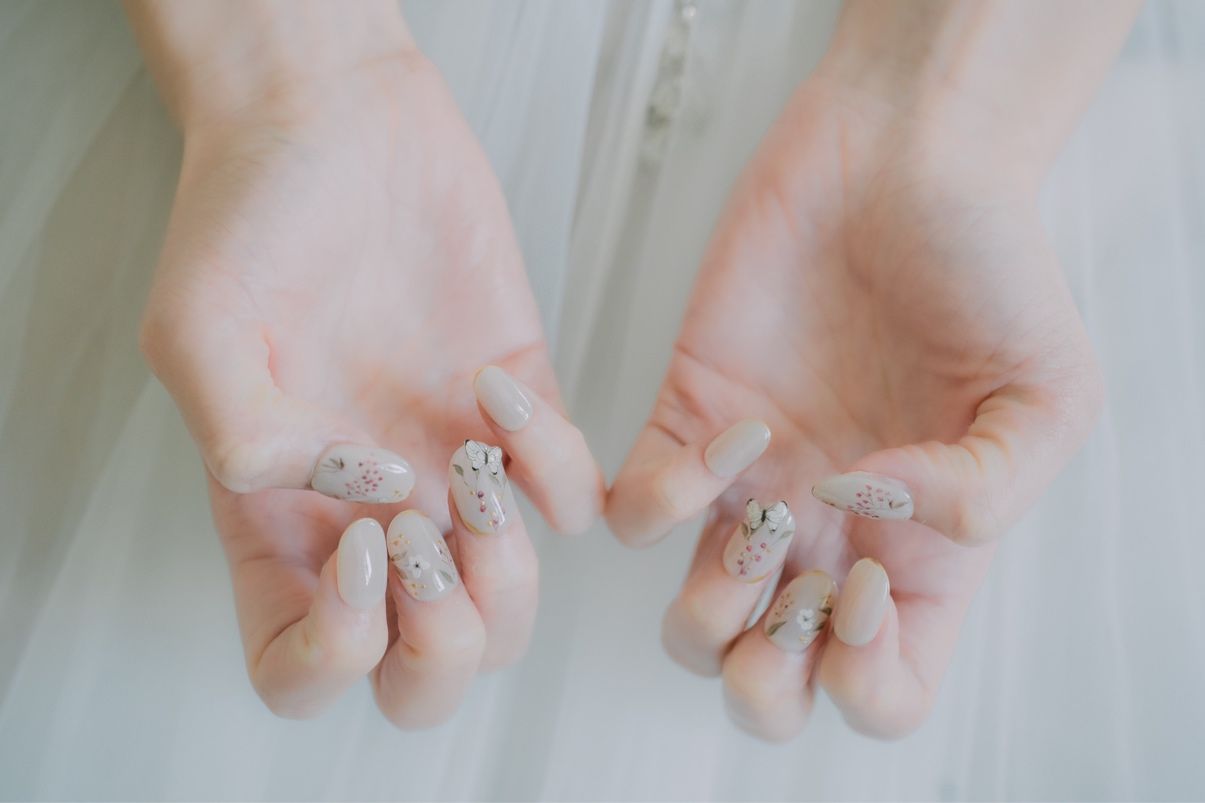 ネイルチップをcreemaというサイトで手作り作家さんから購入しました。薄いくすみピンクに草花と蝶がデザインされていてとても可愛いかったです。