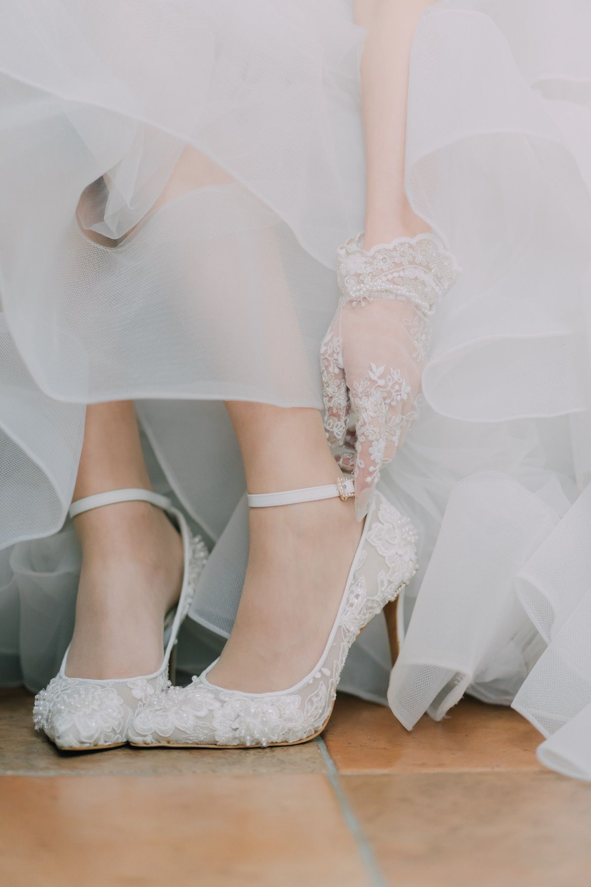 アッパーにはチュールにビーズ刺繍のレースを重ねて繊細な作りに、バックルもビジュー付きのものでキラッとするようにしました!