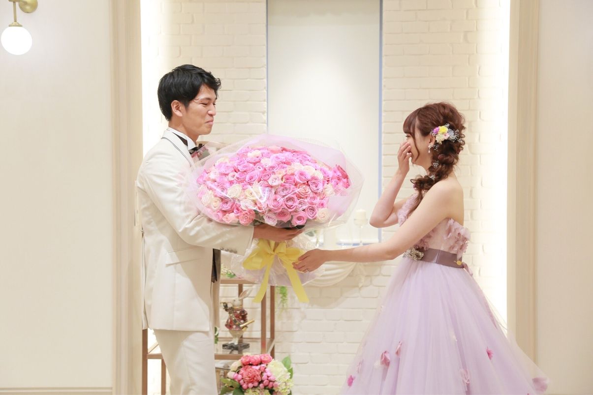 プロポーズの時に刺繍のしてある造花のバラを一輪貰っていたのですが、いつしか本物のバラをもらってみたいと言ったことを覚えてくれていたようで、それも嬉しかったです。ゲストの方もすごくそのシーンの写真を沢山撮ってくれていました。
