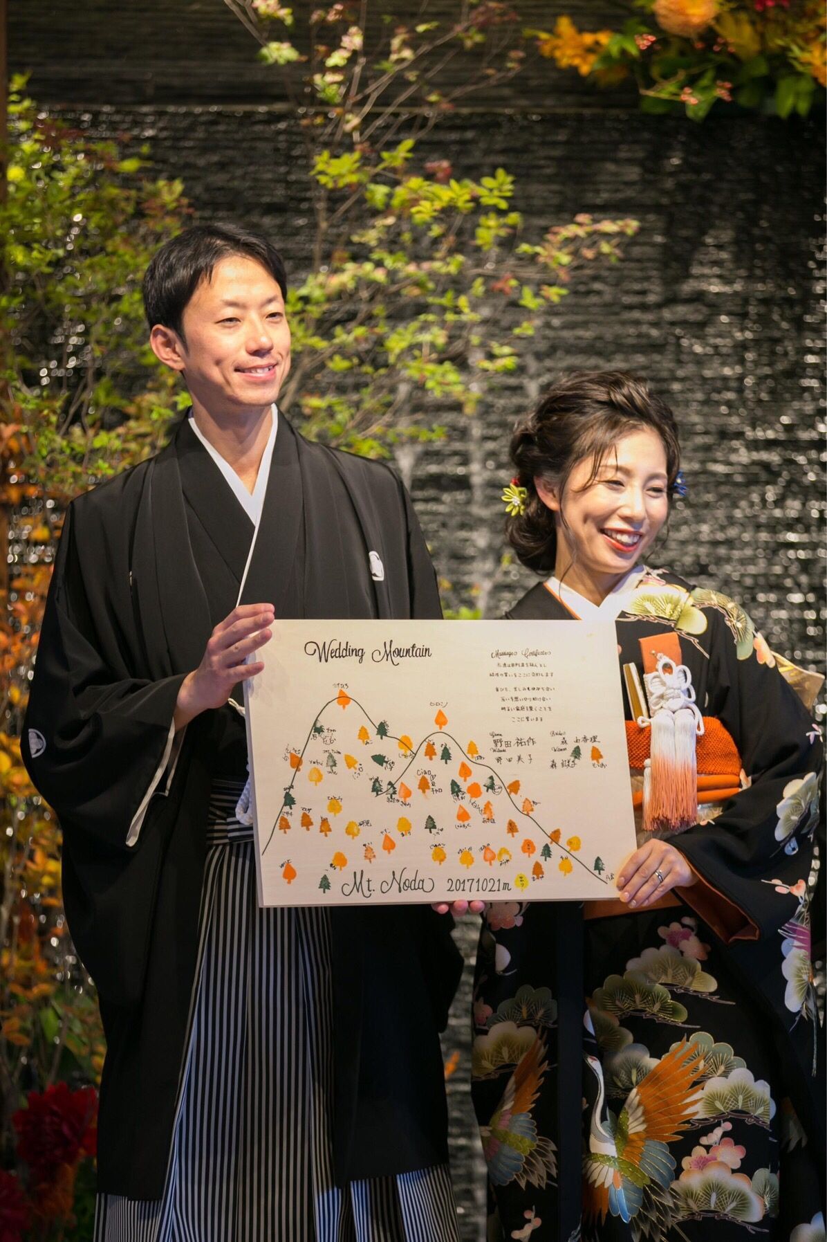 夫婦の趣味の登山をテーマにし、装花やウェルカムスペース、ペーパーアイテムに取り入れました。