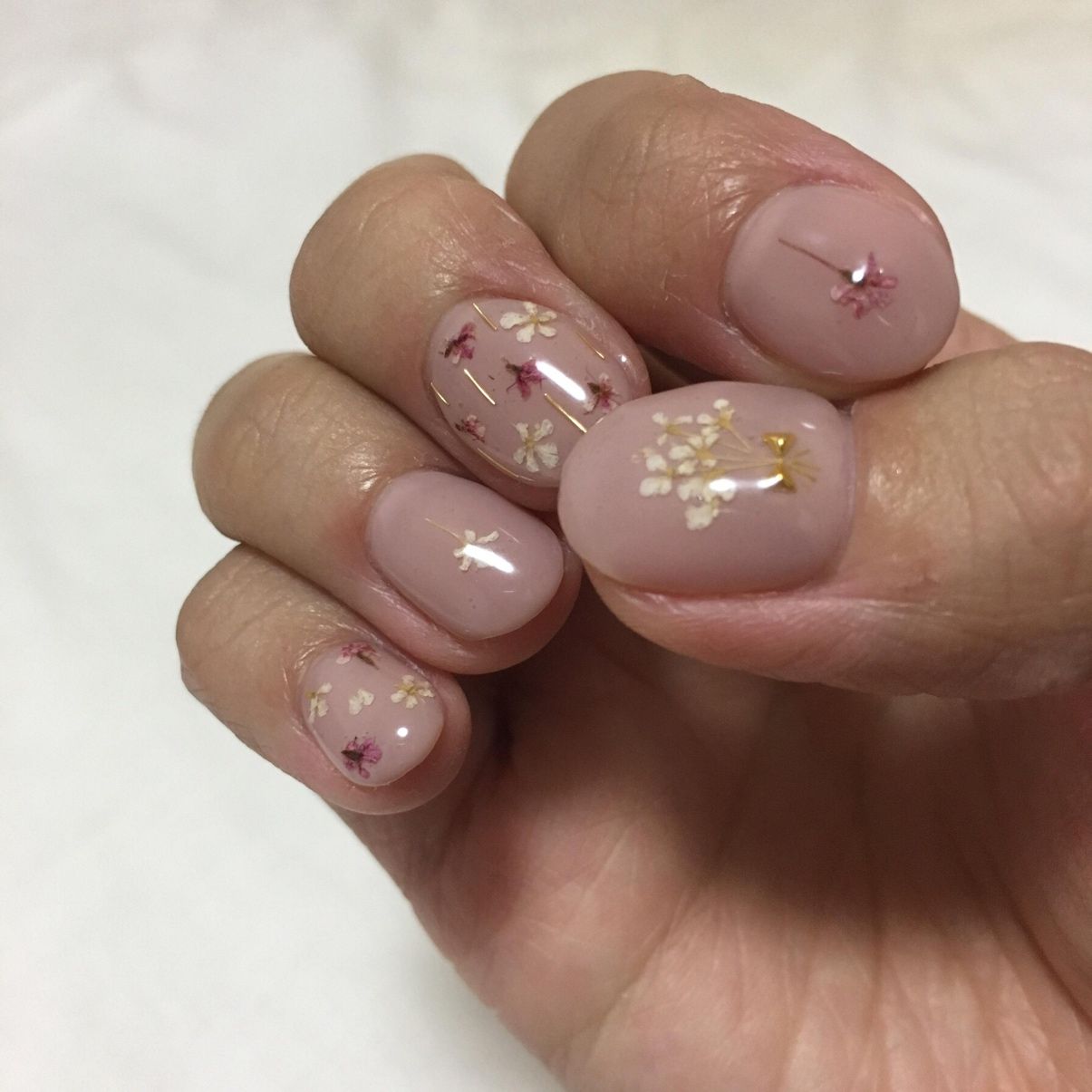 ナチュラルなベビーピンクベースで、押し花風ネイルにしました!