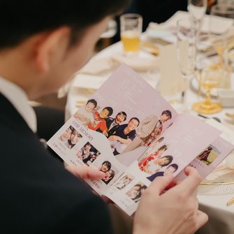 結婚式では、結びにちなんで席札やメニュー表・プロフィールブックなどのペーパーアイテムにリボンのデザインを取り入れました。