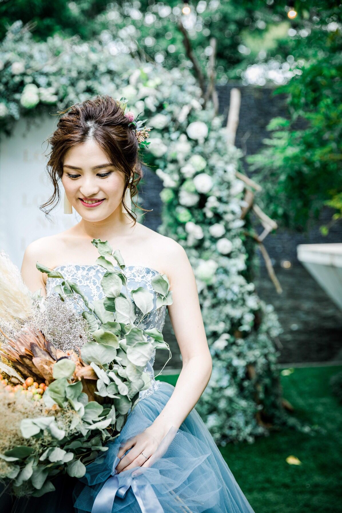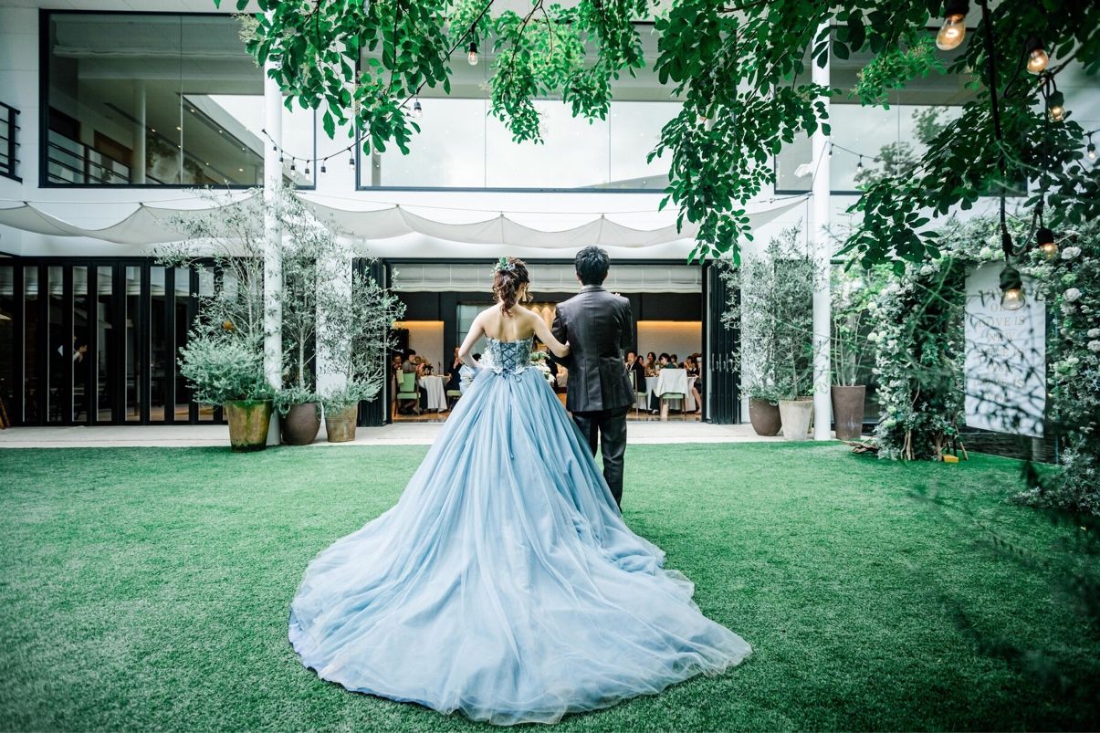 ガーデンの緑とドレスのブルーグレーがマッチして、着用した感じもボリュームがあるけどウエストは締まっててバランスが良いドレスでした。
