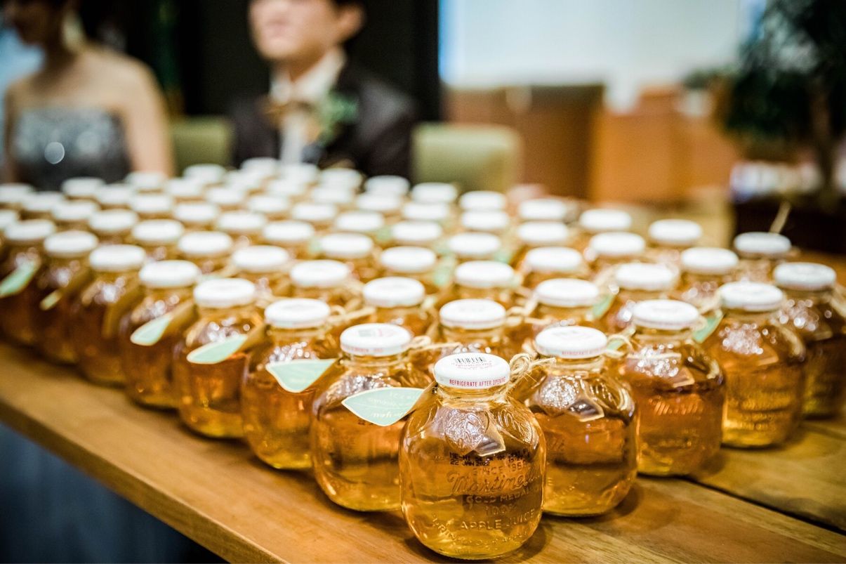 イラストの葉っぱに、挙式の日にちと新郎新婦の名前を入れたものを紐でくくりつけてアレンジしました。