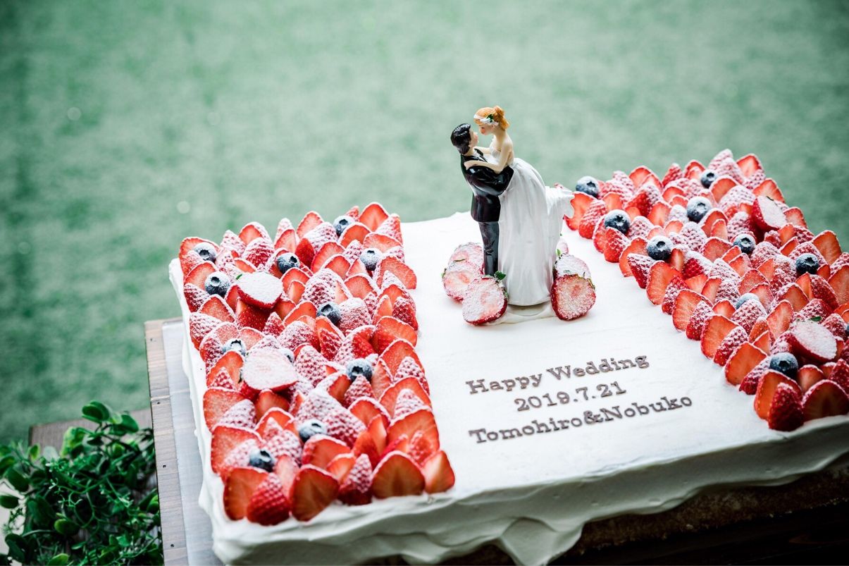新郎新婦の人形を中心にして周りにイチゴで囲いました。 新婦から新郎へのファーストバイトでは、スプーンの大きさをゲストに決めてもらう形式にしました。