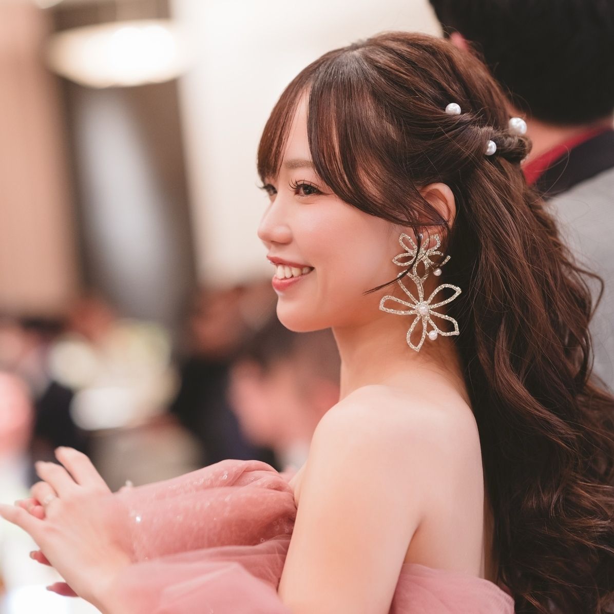 艶のあるベースメイクに、チークやラメ系のアイメイクは多幸感のある仕上がりにしてもらいました。ヘアは挙式ではすっきりと、披露宴入場では髪の長さを生かして高い位置のふわふわポニー、お色直しではハーフツインにして変化をつけています。