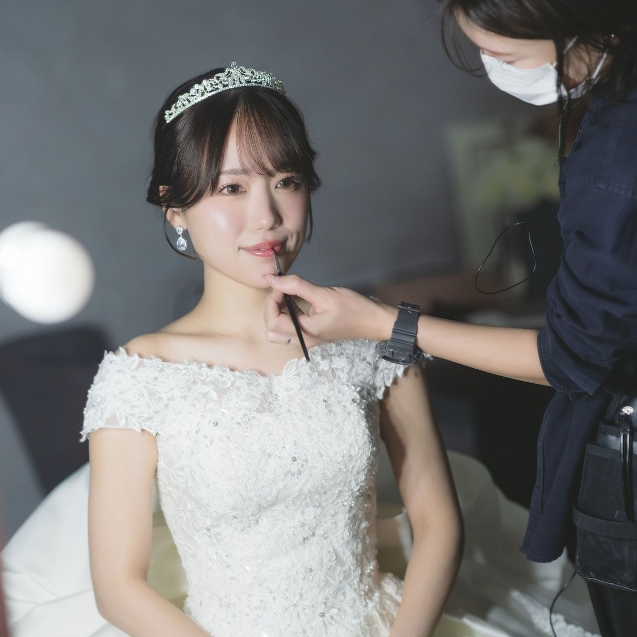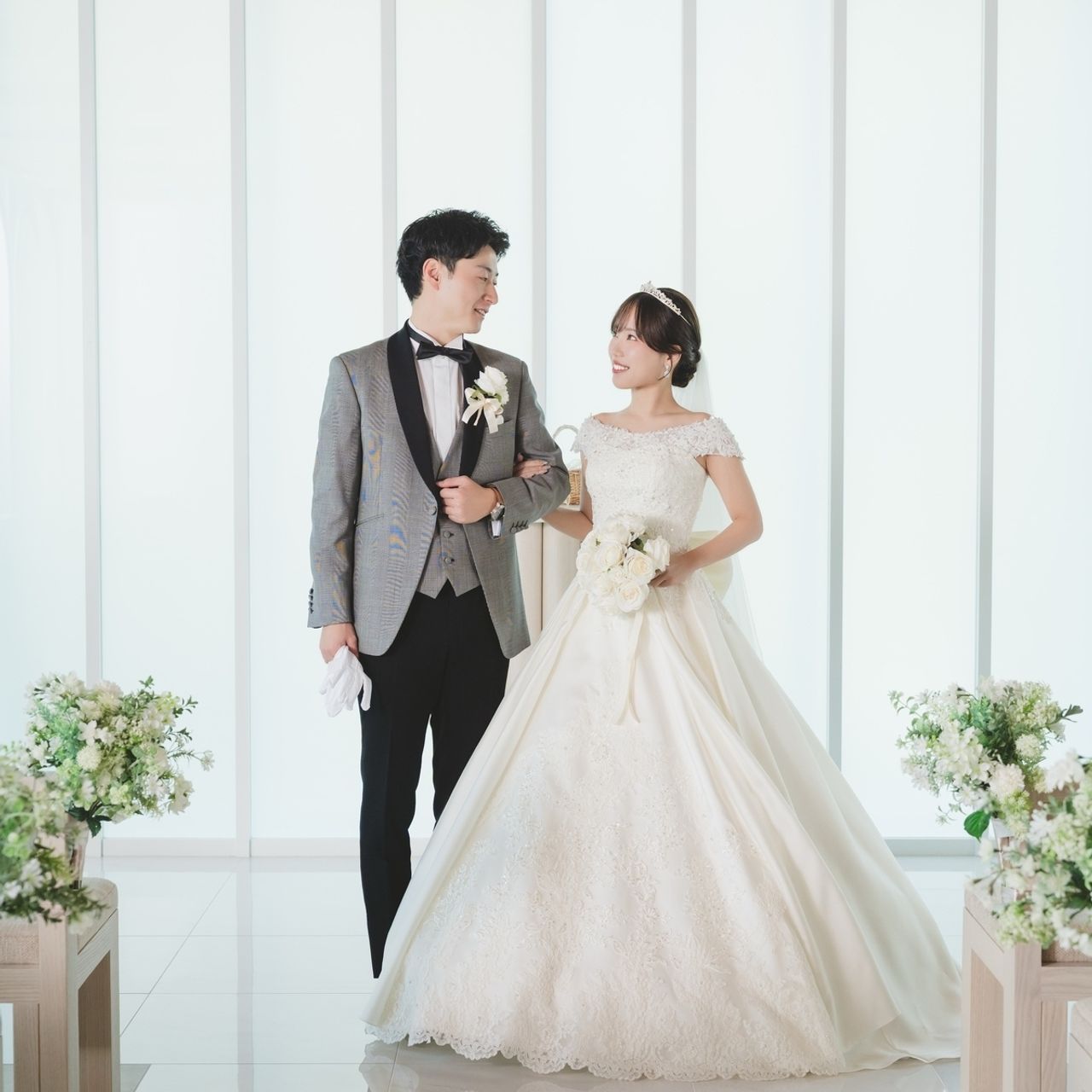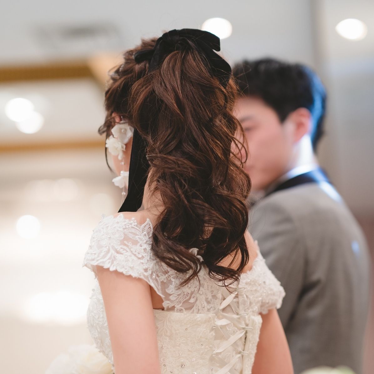 挙式ではティアラ、披露宴入場はベロアリボンを合わせています。