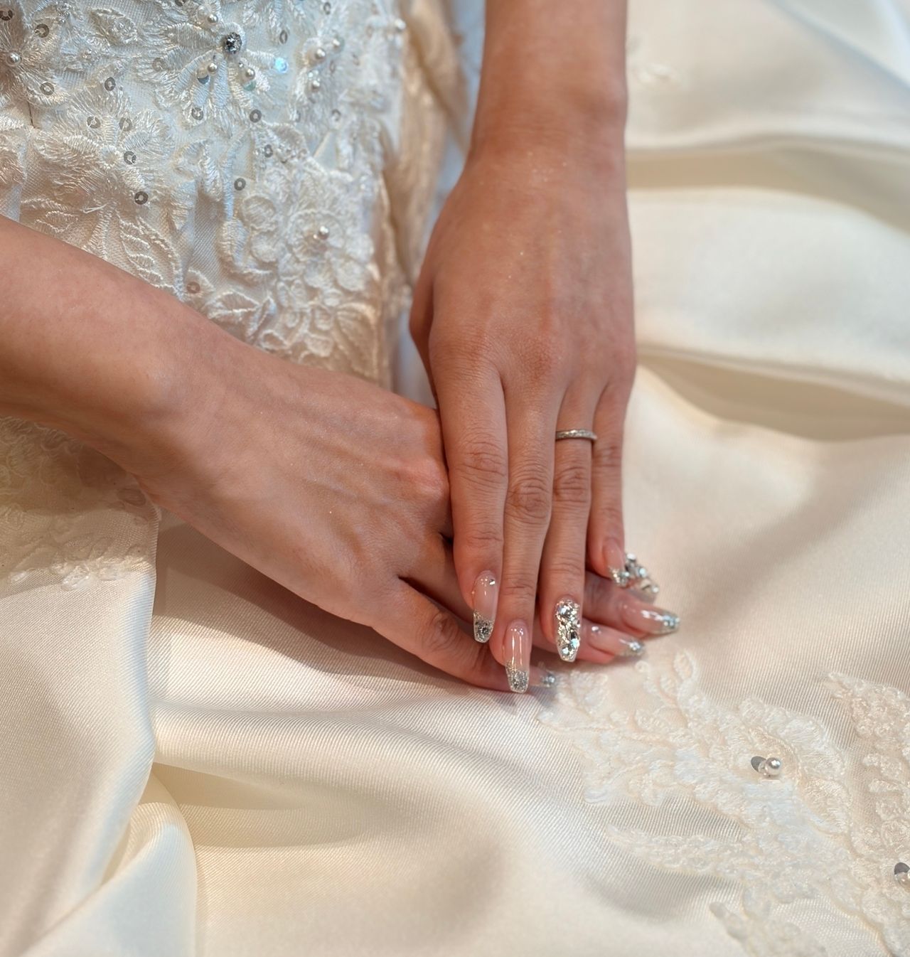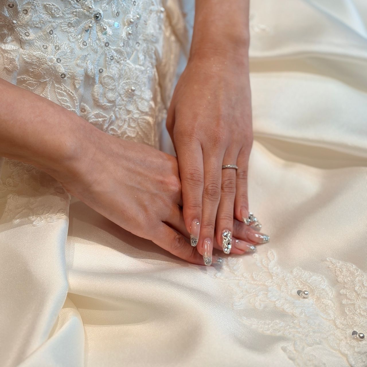 挙式で指輪交換の後、指輪を見せるシーンがあったのでキラキラしているデザインにしました。