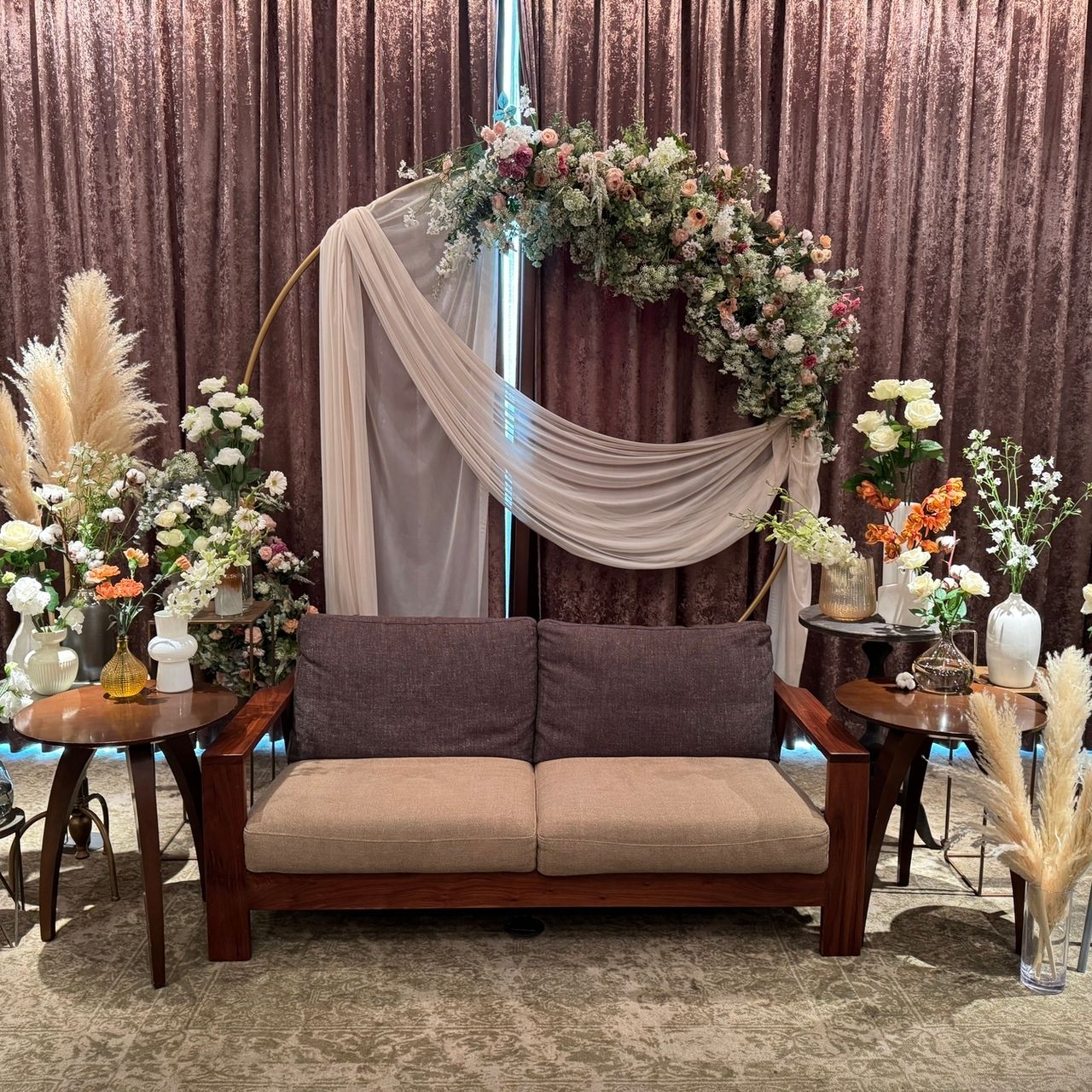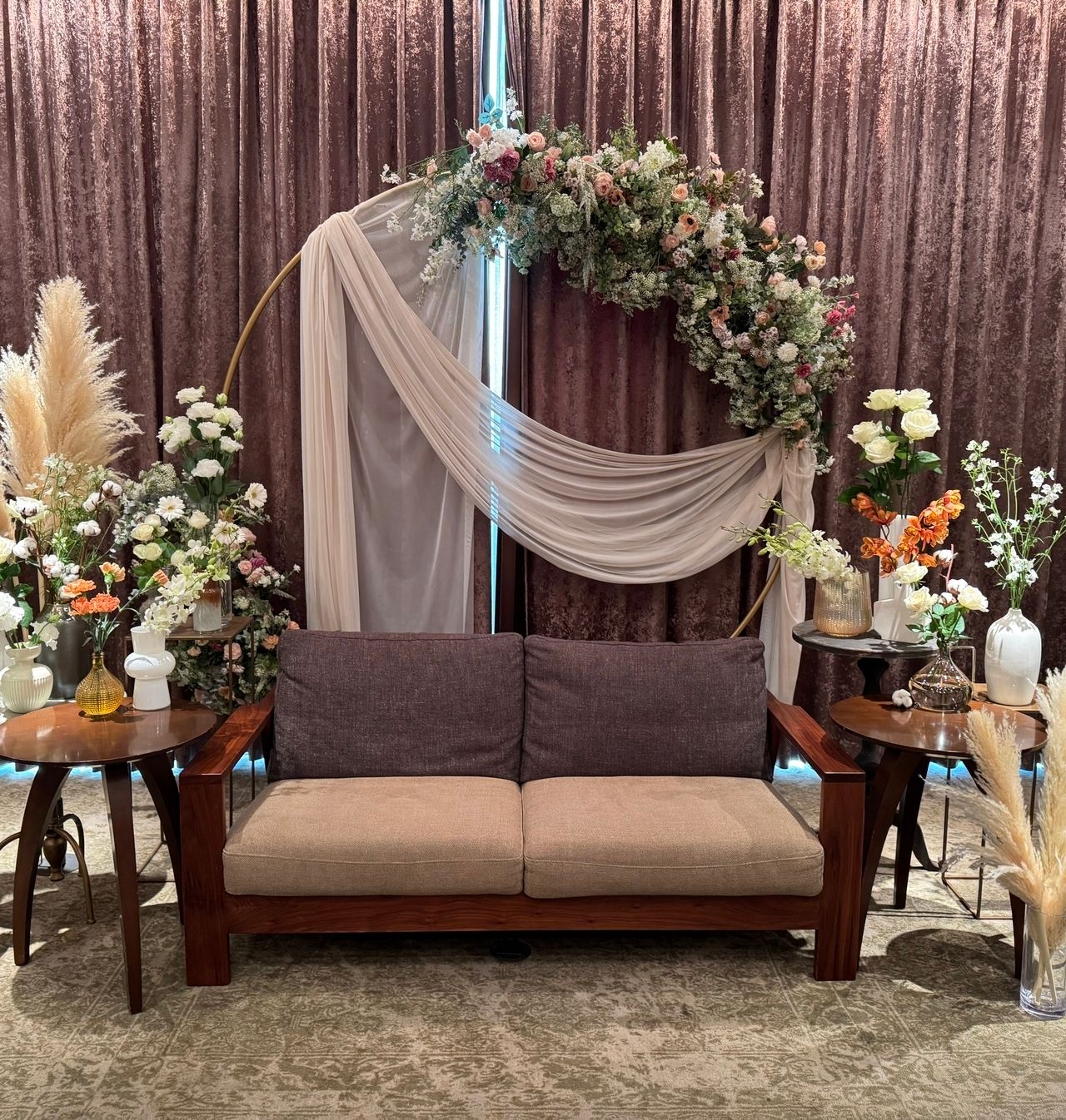 会場がブラウン・ベージュ系だったので、お花はオレンジやアイボリー系でまとめています。パンパスグラスはボリューミーになるのでおすすめです♡