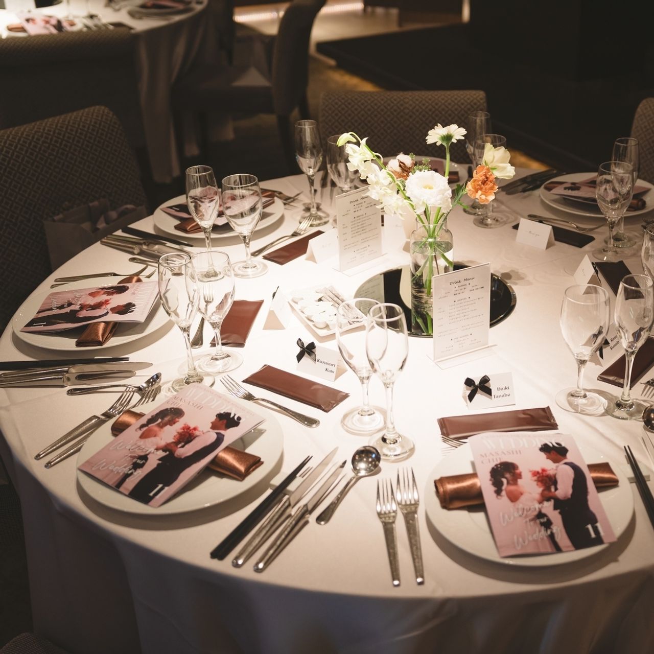 ブラウンベースの会場でお花をたくさん置かなくても高級感が出ます。午後は日が入り逆光になってしまう可能性があるので、写真タイムに入る時はスタッフにカーテンを閉めてもらうのもいいかもしれません。カーテンが閉まっていても会場はとても素敵です。