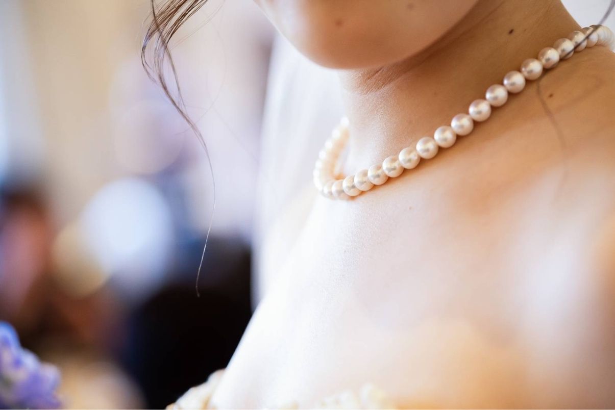 ウェディングドレスでは絶対にパールのネックレスをつけたかったので、ネックレスが引き立つようなドレスを選びました。