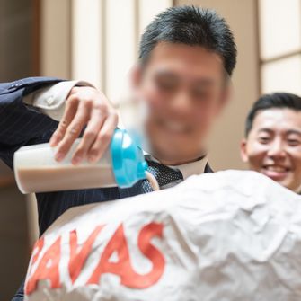 ど定番を取り入れながら、私たちは共通の趣味の筋トレをファーストバイトに取り入れ、ケーキではなく、プロテインセレモニーを行いました。