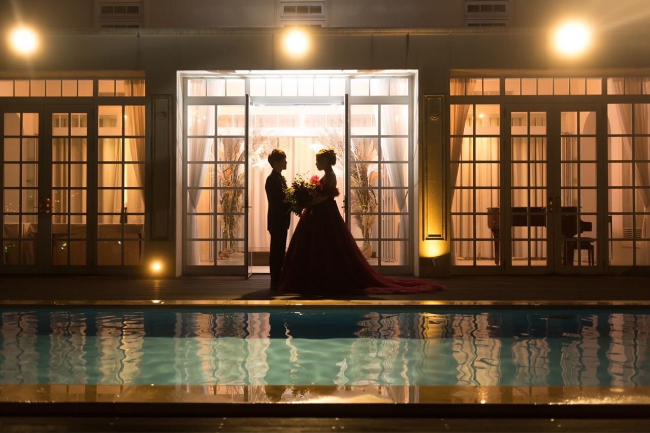 高砂の後ろにはガーデンがあり、私たちの演出の一つとして「カーテンオープン!」の声でデザートビュッフェとスタッフさんたちがプールサイドにいるという演出をしました。