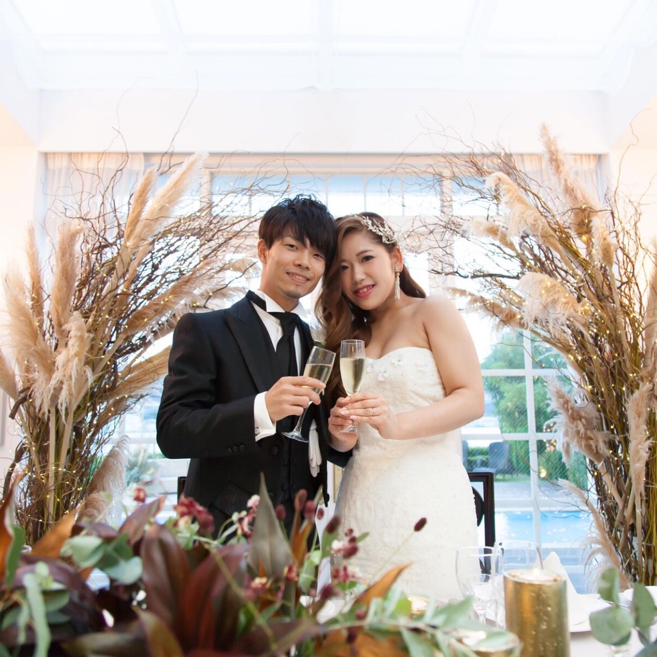高砂のバックにあるパンパスグラスの飾りや、フォトスペースのボタニカルな感じ。ブーケ、、花の色や形、葉の形一つ一つ担当さんに訂正していただきながら話を進めた結果、想像以上のものができました!