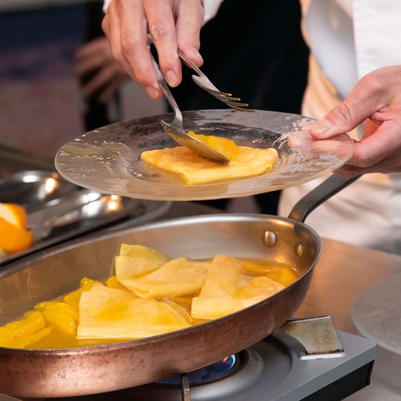 炎が上がり会場がオレンジの香りに包まれ、目や香り、味でも楽しめるお料理でゲストの方にも好評でした。