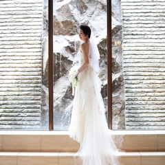 こちらはナチュラルですが、大理石のバージンロードや高い天井が上品さと落ち着きを演出してくれ、また、大きなガラス壁からは自然光が差し、水が流れる岩壁が透明感をプラスしてくれるチャペルが本当に素敵で一目惚れでした。
