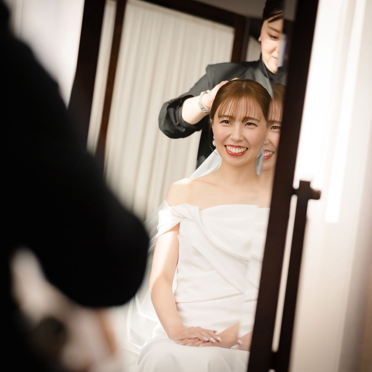 ウェディングドレスのヘアは大人っぽくまとめたアップスタイル。