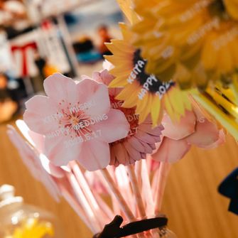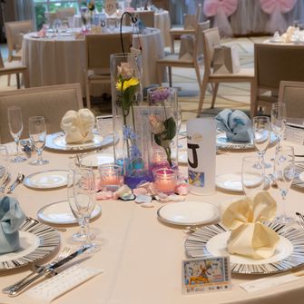 「まるでディズニーに来たみたい!」「素敵な式だった!」と思ってもらえるように、受付やウェルカムスペース、席次表、席札、ウェディングケーキ、はちみつの壺形のウェディングドロップス、お花のプロップスを使ったドレスタキシード当て、ディズニーキャラクターのポーズカードを使ったフォトラウンド、BGM、プチギフトなど、細部までとことんこだわりました♡