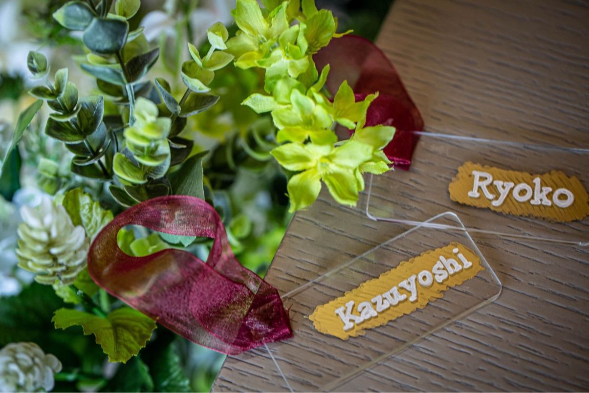フラワーシャワーも自分たちで用意したクラッカーにしたり、ネームプレートはアクリル板を買って作ったり、結婚証明書を貼る台紙も白いのが嫌だったので、ホームセンターで木材を買って作りました!