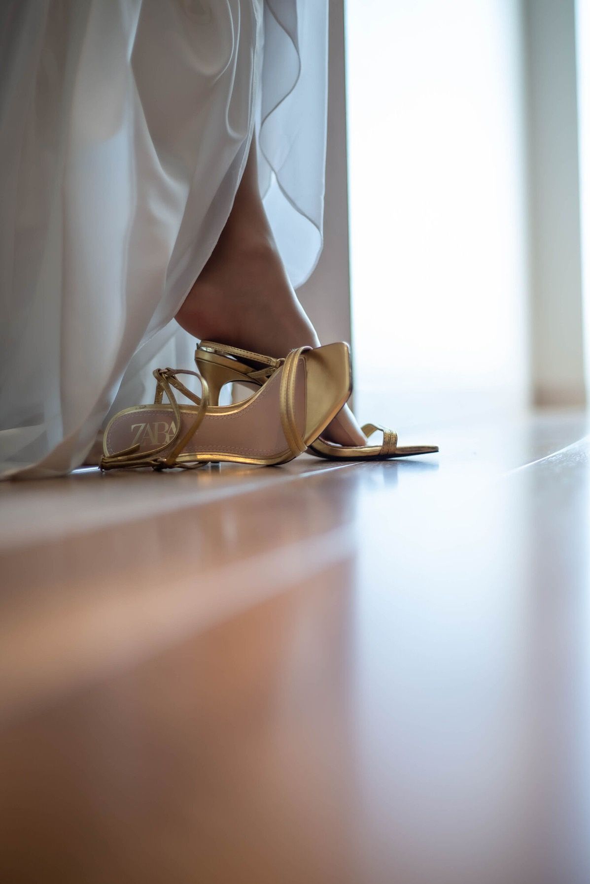 アクセサリーなどは基本的に全てゴールドでまとめていたので、シューズもゴールドに。ピンヒール約8cmで、細めの華奢なデザインにしました✨