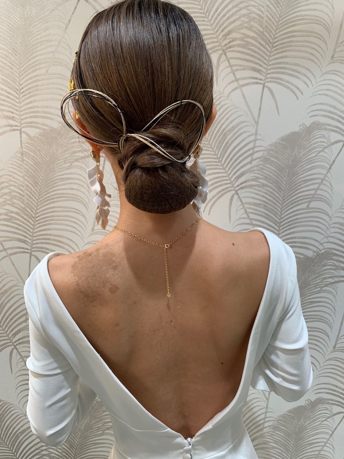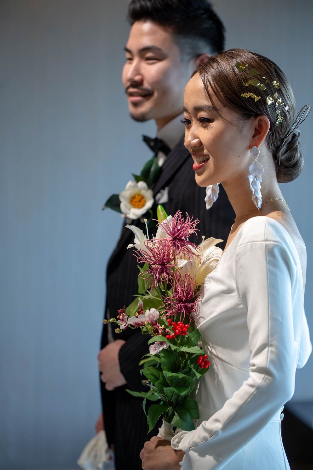 ブーケで百合の花を使ったこともあり、フワッと動かすよりもピタッとタイトにいこうと考えていました。ヘッドパーツにもあえて水引を使用して金箔をあしらい、和風のヘアメイクをチョイスしました!