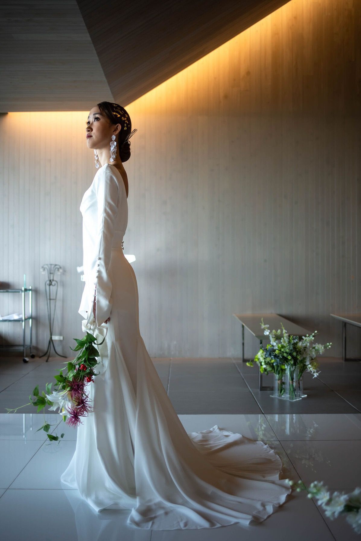 最初は背中の開いているデザインで考えていましたが、袖ありのドレスを試着した時に、あまり見ない形だなと興味を持ちました。ただその時のドレスは、バストのデザインがあまり自分的にはしっくりきておらず。