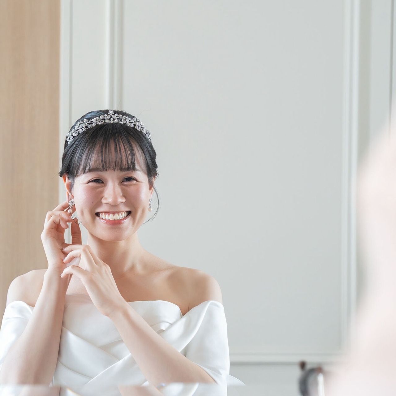 ウェディングドレスでは、以前から憧れていたティアラを着用しました。上品な低めのデザインを選んでいます。