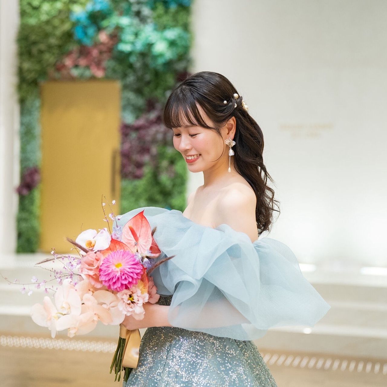 ウェディングドレスのときは全体をシンプルにまとめ、カラードレスではドレスの雰囲気に合わせて、可愛らしいハーフツインに仕上げていただきました。