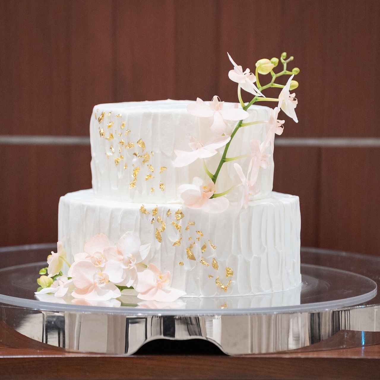 ピンクの蘭の花をあしらった、華やかで上品なウェディングケーキにしました。
